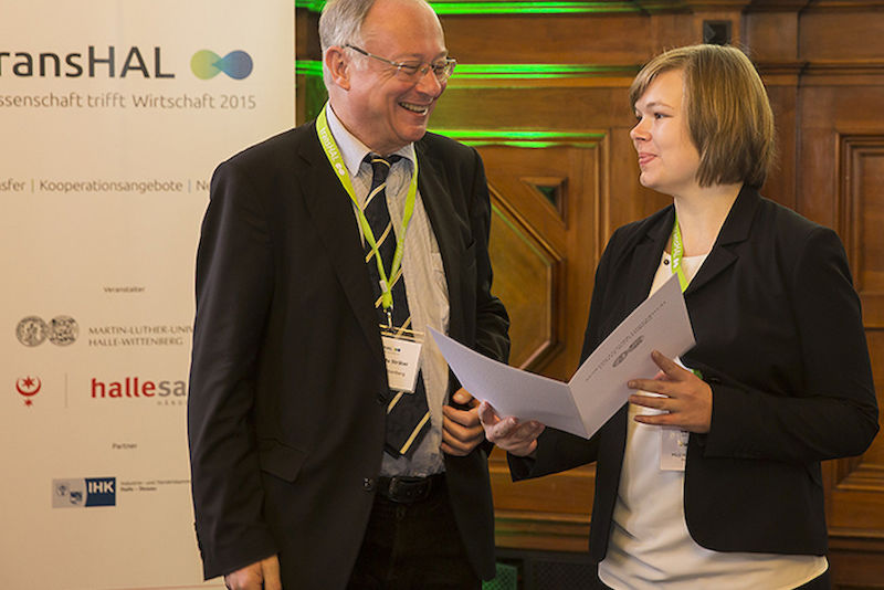 In der Kategorie „Anwendungsorientierte Abschlussarbeiten“ wurde Dr. Diana Döhler vom Institut für Chemie für ihre herausragende Dissertation zum Themengebiet der selbstheilenden Polymere geehrt, die unter anderem im Flugzeugbau Anwendung finden. Martha Wellner, Absolventin im Bereich Ernährungswissenschaften an der MLU, hat sich in ihrer Masterarbeit mit der Herstellung von neuen Süßwarenprodukten beschäftigt und entwickelte eine Krustenpraline mit elastischen Gel-Kern, also im Prinzip ein mit Zuckerkruste umhülltes Gummibärchen. Sie erhielt den Transferpreis in der Kategorie „Anwendungsorientierte Abschlussarbeiten“. Das Preisgeld für beide Arbeiten in Höhe von insgesamt 1.500 Euro wurden von der Stadtwerke Halle GmbH gestiftet.