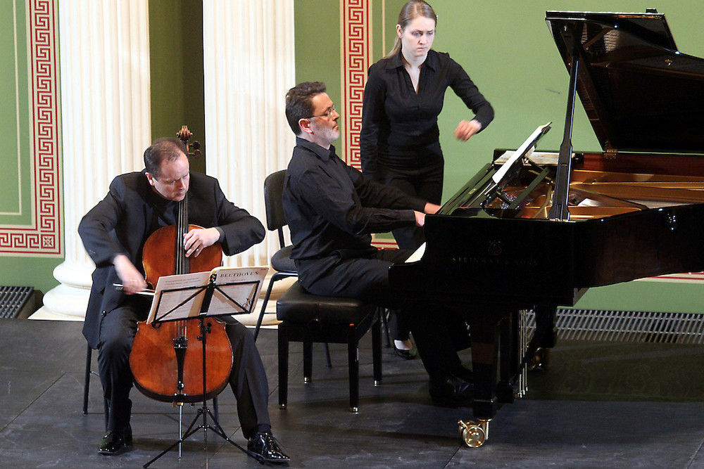 Zu Beginn erklangen die Sieben Variationen in Es-Dur über das Duett „Bei Männern welche Liebe fühlen“ WoO 46von Ludwig van Beethoven (1770–1827). Der Komponist wählte das Thema aus Wolfgang Amadé Mozarts Oper „Die Zauberflöte“ und verlieh ihm durch spielerische Veränderungen ein eigenes musikalisches Gepräge. Die Rolle des Papageno übernahm teilweise das Violoncello, die der Pamina das Klavier. Nach anfänglich leichten, aber unwesentlichen Intonationsproblemen verstand es Peter Hörr die melodischen Phrasen mit seinem Instrument deutlich herauszuarbeiten, alles wurde transparent gestaltet. Paul Rivinius' Begleitung war angemessen, farbig und facettenreich. Große Sorgfalt waltete auch bei der Übertragung der textlichen Diktion der Vorlage auf die solistisch hervortretenden Instrumente.