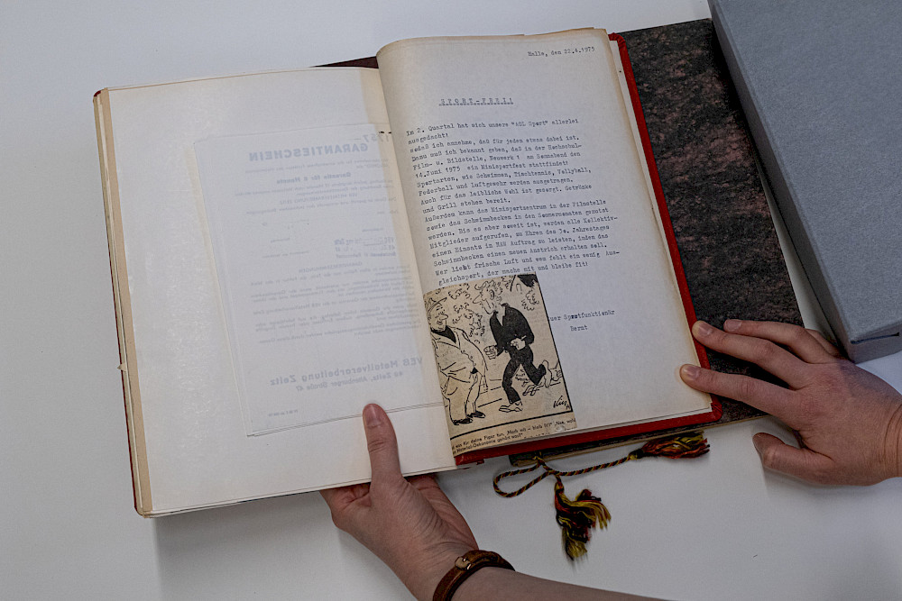 Das Brigadebuch der Gruppe „Düngung“ begann im Frühjahr 1974. Die 16-köpfige Gruppe gehörte zur Landwirtschaftlichen Fakultät der MLU und trug den Titel „Kollektiv der sozialistischen Arbeit“. Zu den Ereignissen, die 1974 Eingang in das Buch fanden, gehörte unter anderem der Besuch einer Revue am 9. Januar, der Rosenmontag im Februar sowie eine Feier für die Frauen am 25. März, die im Heide-Krug stattfand und bei der die Teilnehmenden „nach anfänglichen Schwierigkeiten“, so liest man, „doch noch einen schönen Platz im ‚Grünen Salon‘ erhielten“. Die Seiten zu den einzelnen Aktivitäten sind aufwändig gestaltet: Aufgeklebte Zeitungsausschnitte, oft ergänzt durch Zeichnungen, farbig herausgehobene Überschriften, aber auch ganze Foto-Collagen reihen sich aneinander. „Man sieht, dass da jemand wirklich Spaß an der Gestaltung hatte“, sagt Karin Keller, stellvertretende Leiterin des Universitätsarchivs der MLU.