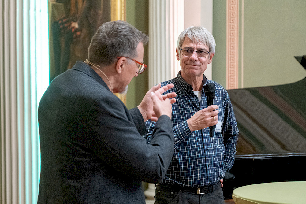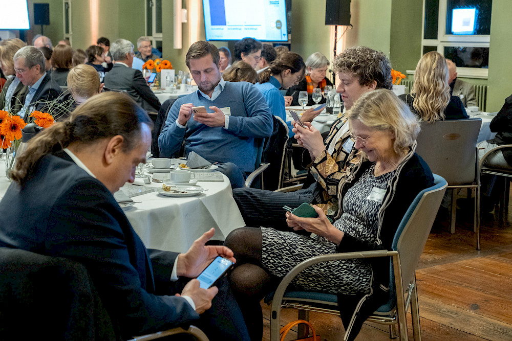 Letzteres sorgte für einen thematischen Fokus bei der diesjährigen Deutschlandstipendien-Vergabe. Germanist Dr. Nico Elste berichtete im Interview mit dem Moderator der Veranstaltung Gerald Perschke, Journalist und selbst Förderer, zum Beispiel aus der Geschichte seines Fachs. In einem kurzweiligen Frage-Antwort-Spiel unterzog Elste die Gäste zudem per Umfragetool einem kleinen Rechtschreib- und Grammatiktest, natürlich inklusive anschließender Erklärungen. So erfuhren die Anwesenden auch, wie hoch der Anteil von „Bauchkommatasetzern“ ist, welche Tücken die deutsche Sprache für Schülerinnen und Schüler bereithält und was das alles für die Ausbildung von künftigen Lehrerinnen und Lehrern an der MLU bedeutet.