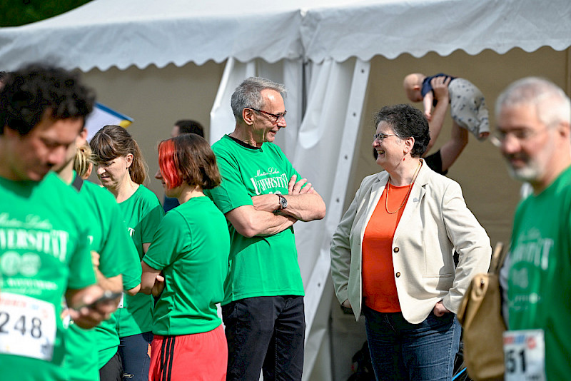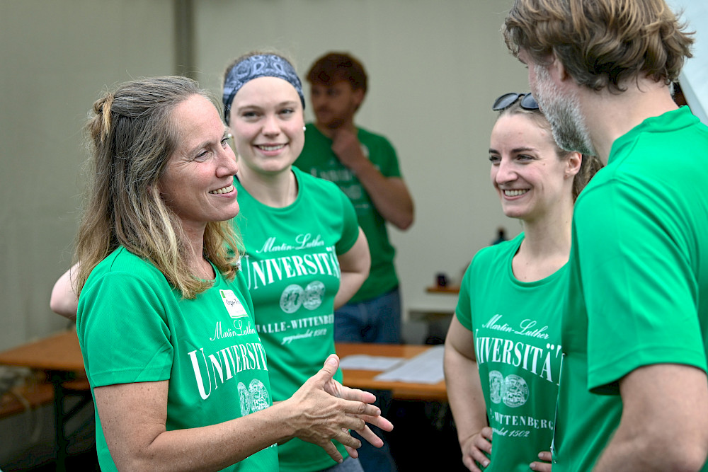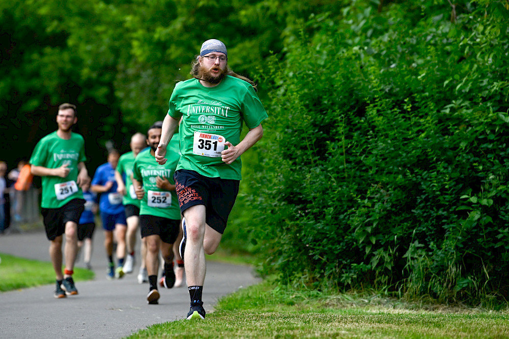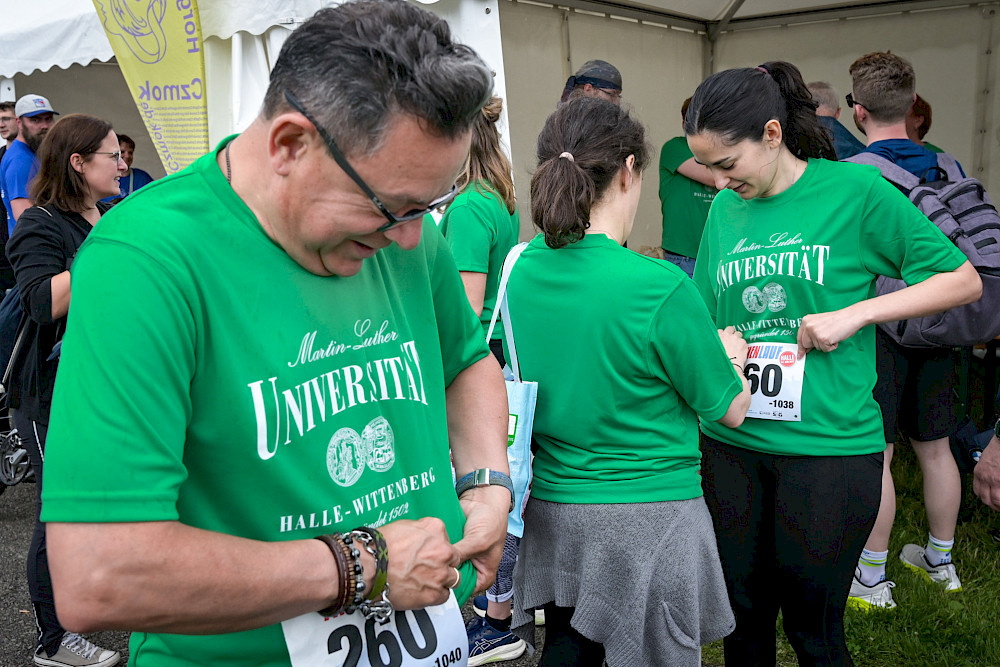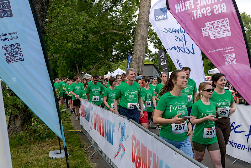 Mit 36 Teams ist die MLU in diesem Jahr zum ersten Mal beim Firmenlauf Halle an den Start gegangen. Damit erreichte die Universität bei ihrem Debüt Platz zwei in der Wertung für die meisten Teilnehmerinnen und Teilnehmer. Für die MLU absolvierten 144 Läuferinnen und Läufer die 2,5-Kilometer-Strecke, die meisten davon in grünen Uni-Shirts.