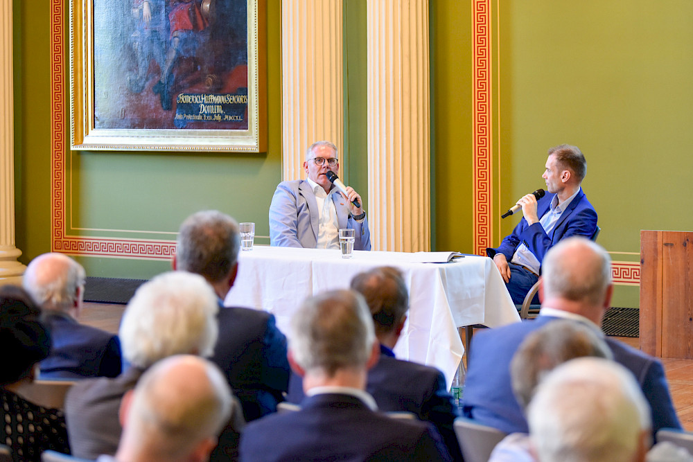Eröffnet wurde der Abend von Rektorin Prof. Dr. Claudia Becker und Prof. Dr. Ralf Michael Ebeling, Vorstandsvorsitzender des Instituts für Unternehmensforschung und Unternehmensführung an der MLU (ifu). Das ifu ist Veranstalter der Halleschen Wirtschaftsgespräche. Zusammen mit der Juristischen und Wirtschaftswissenschaftlichen Fakultät lädt das Institut seit 1994 regelmäßig renommierte Referentinnen und Referenten an die Universität ein. Vor Marco Thiele waren der Klima-Ökonom Ottmar Edenhofer und die Wirtschaftsweise Monika Schnitzer zu Gast.