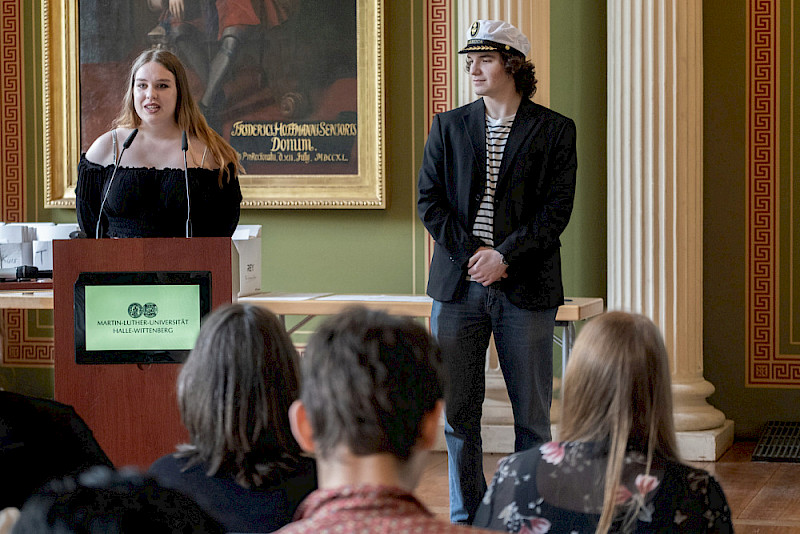 Dr. Katrin Krüger, Leiterin des Landesstudienkollegs, erinnerte sich bei ihrer Begrüßungsrede an eine Aussage, die sie selbst vor einigen Jahren bei ihrem Amtsantritt in Halle getroffen hat: „Ich finde alle Kollegiatinnen und Kollegiaten sehr mutig“, sagte sie – weil sie als junge Menschen die Herausforderung annehmen, ein Studium im Ausland zu absolvieren. Zur Zeugnisübergabe rief sie die Absolventinnen und Absolventen dazu auf, sich auch in einer Zeit von Kriegen und schwierigen politischen Verhältnissen nicht entmutigen zu lassen. „Sie sind auf Ihrem persönlichen, richtigen Weg. Sie haben viele, viele Chancen. Und wir sind natürlich alle davon überzeugt, dass Sie diese Chancen auch nutzen werden“, so Krüger.
