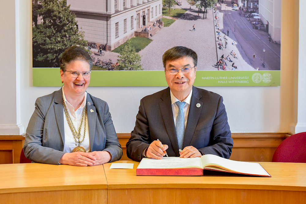 Geleitet wurde die UIBE-Delegation vom Präsidenten der Universität Prof. Dr. Zhongxiu Zhao, der sich auch ins Goldene Buch der MLU eintrug. In den Gesprächen verständigten sich die Beteiligten darauf, Kooperationsverträge verlängern zu wollen. Die UIBE ist eine 1951 in Peking gegründete Hochschule mit Schwerpunkten in Wirtschaft, Management, Recht, Literatur und Naturwissenschaften. Sie hat rund 16.000 Studierende.