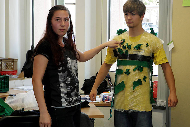 Ein Schüler wird in Luftpolsterfolie eingewickelt und mit bunten Klebebandstreifen verziert, um ihn herum stehen weitere Jugendliche, die ihn nachdenklich beäugen, lachen und auf Englisch diskutieren. Außenstehende könnten sich fragen, was 20 Jugendliche dazu bewegt, sich an einem warmen Herbsttag gegenseitig in Stoff und Folie zu hüllen. Die Antwort: Ein Kreativitätsworkshop, ausgerichtet vom Gründerservice der Uni Halle. Der Tag steht unter dem Motto „Smart textiles – what will tomorrow’s clothing look like?“ Jonas Kühl vom Gründerservice und zuständig für die Bereiche Ideengenerierung und Gründungsbegleitung erklärt: „Die Thematik wurde bewusst gewählt, weil jeder einen Bezug zu Kleidung hat.“
