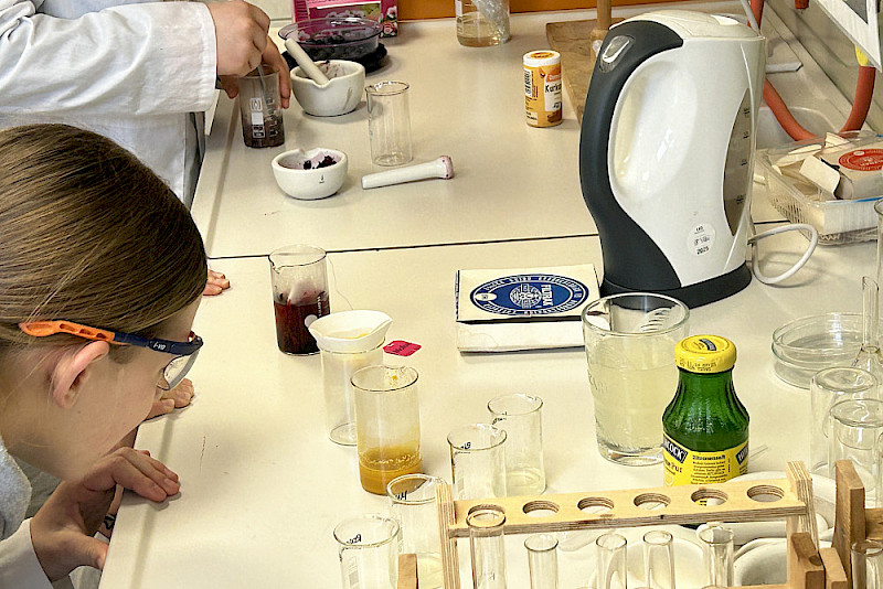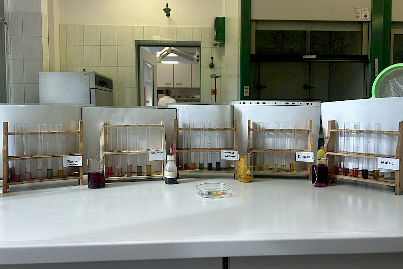 An den beiden anderen Stationen der „Acid Games“ konnten die Jugendlichen selbst im Labor experimentieren. Zum Beispiel mit unterschiedlichen Indikatorlösungen, mit denen sich der Säuregehalt von Flüssigkeiten ermitteln lässt. Im Unterricht wird dafür neben Universalindikator meist Rotkohl- oder Radieschensaft verwendet. Sie habe den Jugendlichen zeigen können, „dass es ganz viele natürliche Indikatoren gibt und die nicht immer rot sind“, sagte Studentin Lea-Sophie Schmidt. Zudem kamen auch hier digitale Verfahren zum Einsatz, konkret Methoden der digitalen Messwerterfassung mittels Elektrode.