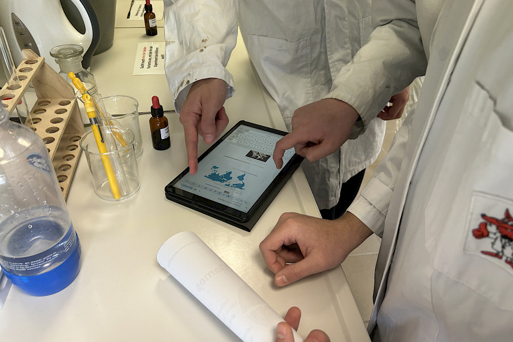 „Der Schwerpunkt digitale Medien war klasse für uns – und für die Schüler“, sagte Studentin Lea-Sophie Schmidt, die auf Lehramt für Gymnasien für die Fächer Chemie und Biologie studiert. So habe man zahlreiche Learning-Apps einsetzen und den Umgang mit Tablets vermitteln können, die vom Zentrum für Lehrer*innenbildung bereitgestellt wurden. Das von den Studierenden erarbeitete Konzept sah vor, dass die Schülerinnen und Schüler an insgesamt vier Stationen Aufgaben lösen und dabei Punkte sammeln. Bei zwei Stationen waren diese Aufgaben rein digital: In Mini-Games wurde im Stil von „Wer wird Millionär?“ Wissen zu Säuren abgefragt und damit auch vermittelt. Das Rätsel der Braunfärbung von Apfelstückchen konnte im „Virtual Lab“ des Chemiekonzerns BASF gelöst werden – einem seit 2011 existierenden interaktiven Online-Labor, das sich an Schülerinnen und Schüler richtet.
