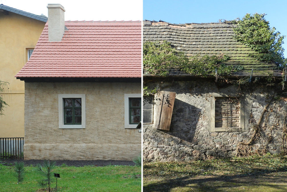 Da das Mauerwerk völlig marode war, mussten bei der Sanierung die Grundmauern sehr weit abgetragen werden. „Ein kleiner Teil der Dachkonstruktion war noch nutzbar und wurde auch wieder verbaut. Der Rest musste auf Bauhöfen eingekauft werden, die mit altem Holz handeln.“ Viele der Details, wie Fenster, Türen und auch das Dach, sind Maßarbeiten.