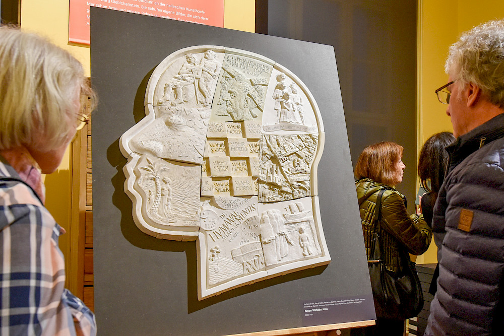 Mit der Frage, wie eine zeitgemäße Erinnerung an Anton Wilhelm Amo aussehen könnte, befasst sich auch die Ausstellung "Fokus Amo. Bilder für einen Gelehrten", die seit Oktober im Löwengebäude zu sehen ist. Neun Künstlerinnen und Künstler – Steffen Ahrens, Rossen Andreev, Grit Berkner, Bernd Göbel, Katharina Günther, Georg Mann, Martin Roedel, Carsten Theumer und Heidi Wagner-Kerkhof – haben dafür gemeinsam ein Werk geschaffen, das sich dem Menschen und seinem Leben annähert. Das zur Ausstellungseröffnung enthüllte Gipsmodell "Anton Wilhelm Amo" ist Grundlage für eine Umsetzung im Metallguss.
