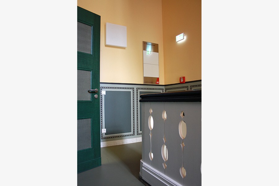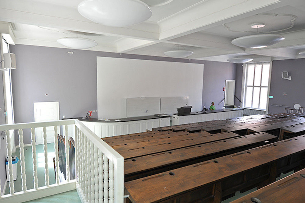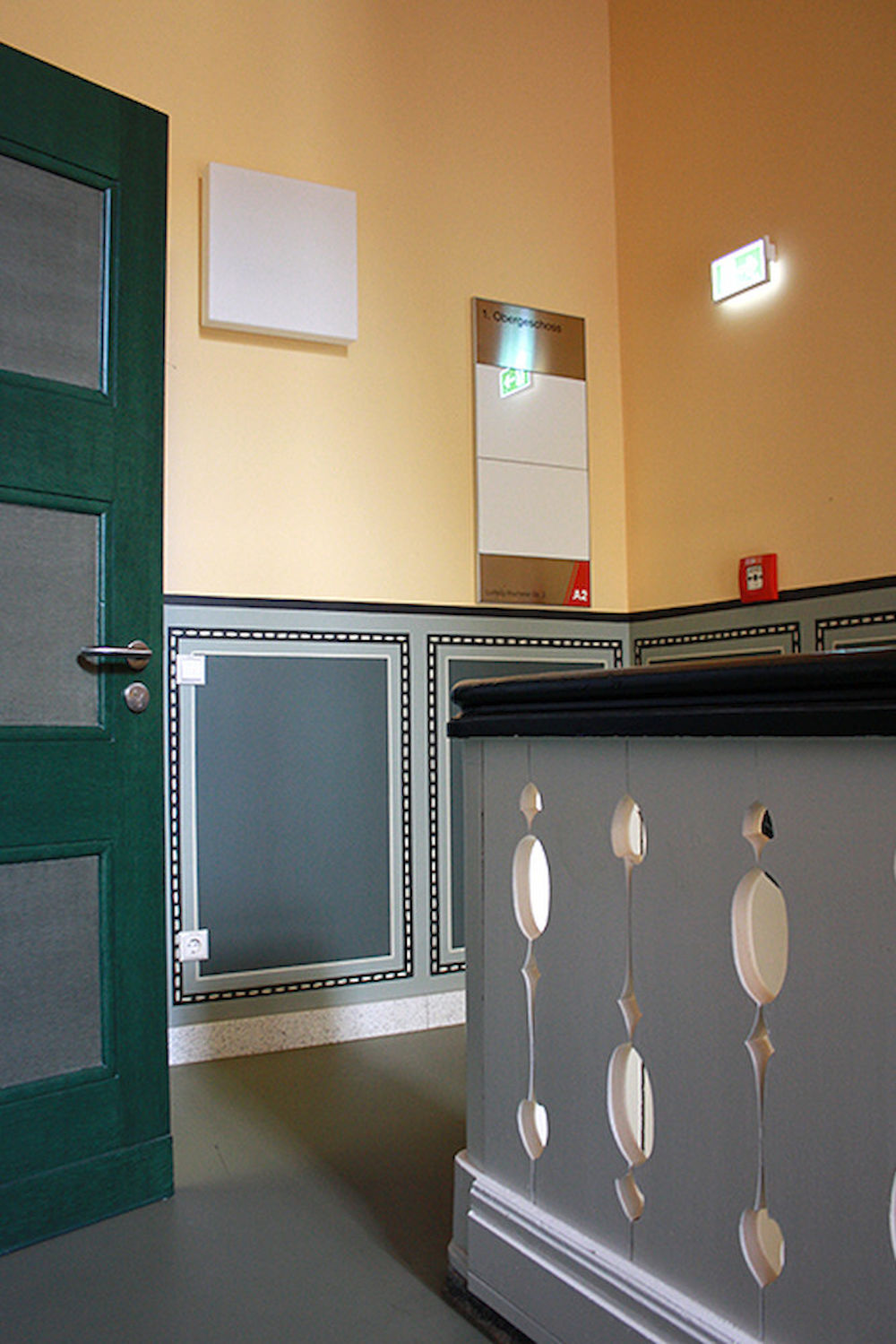 Ungewöhnlich farbig wirkt das Innere der Altbauten. „Wo es möglich war, sind die durch restauratorische Untersuchungen ermittelten ursprünglichen Farben und Muster wieder hergestellt worden“, erläutert Alexander Keck. Die Agrarwissenschaftler mochten es damals offensichtlich bunt: lila, grün, weinrot oder orange sind die Wände gestrichen. Und die original erhaltenen mechanischen Fensterheber, schmiedeeiserne Türgriffe sowie die wiederaufgearbeitete Originalbestuhlung in den historischen Hörsälen verleihen den Gebäuden ihren ganz eigenen Charme und Charakter.