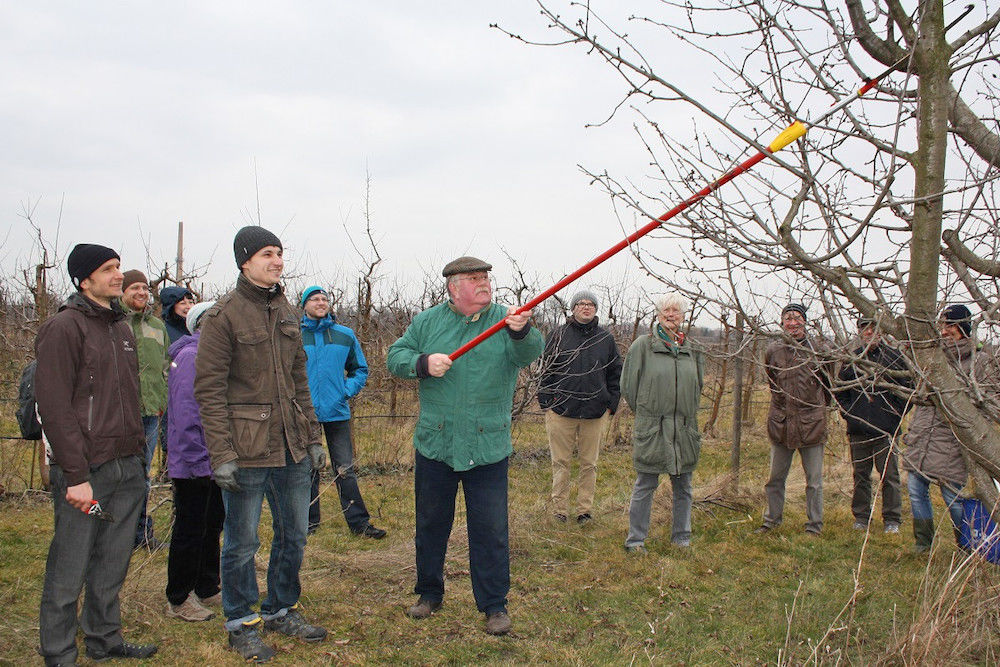 Ein kleines Feld voller Obstbäume: Wie kann man Apfel-, Birnen- und Pflaumenbäume voneinander unterscheiden, wenn keine Früchte daran hängen? Und wie unterscheidet man Sauer- von Süßkirschbäumen? Wo setzt man bei welchem Baum wie die Schere an? Nachfragen ist jederzeit erlaubt. Matthias Hinz erklärt alles genau, verteilt Astscheren und sagt motivierend: „Schneiden Sie einfach drauf los, Sie können da gar nicht viel falsch machen!“
