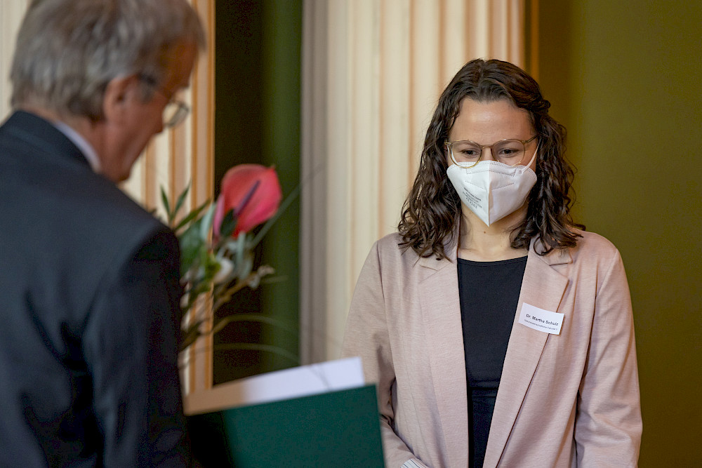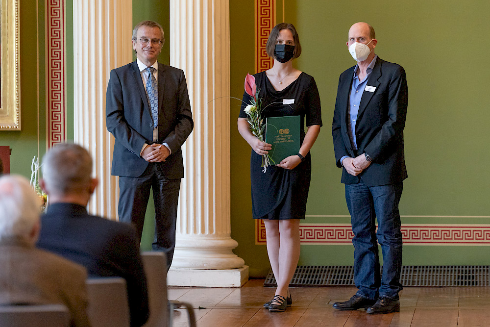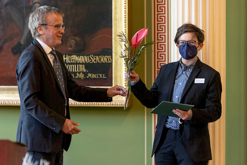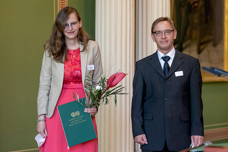 Verliehen wurden auf der Festveranstaltung nicht nur die Lutherurkunden für Promovenden, die mit der Bestnote „summa cum laude“ abgeschlossen haben, sondern auch die diesjährigen Universitätspreise. Den mit 1.500 Euro dotierten Christian-Wolff-Preis erhielt PD Dr. Constanze Pinske (Naturwissenschaftliche Fakultät I) für ihre Habilitation "Bioenergetik des Wasserstoff-Stoffwechsels". Die Dorothea-Erxleben-Preise für die besten Dissertationen (jeweils dotiert mit 1.000 Euro) gingen an Phries Sophie Künstler (Philosophische Fakultät III) für die Arbeit "Prekäre Subjektivierung - zum Verhältnis von Anrufung, Anerkennung und Verwehrung im Kontext 'prekärer Mutterschaft'" sowie Martha Schulz (Naturwissenschaftliche Fakultät II) für ihre Arbeit "Einfluss intrakristalliner Dynamik auf Morphologie und Schmelzverhalten teilkristalliner Polymere". Den Anton-Wilhelm-Amo-Preis erhielt Friederike Elisa Wührl (Naturwissenschaftliche Fakultät II) für ihre Masterarbeit "Strukturanalyse oxidischer Quasikristallapproximanten auf Palladium Pd (111)". Auch er ist mit 1.000 Euro dotiert.