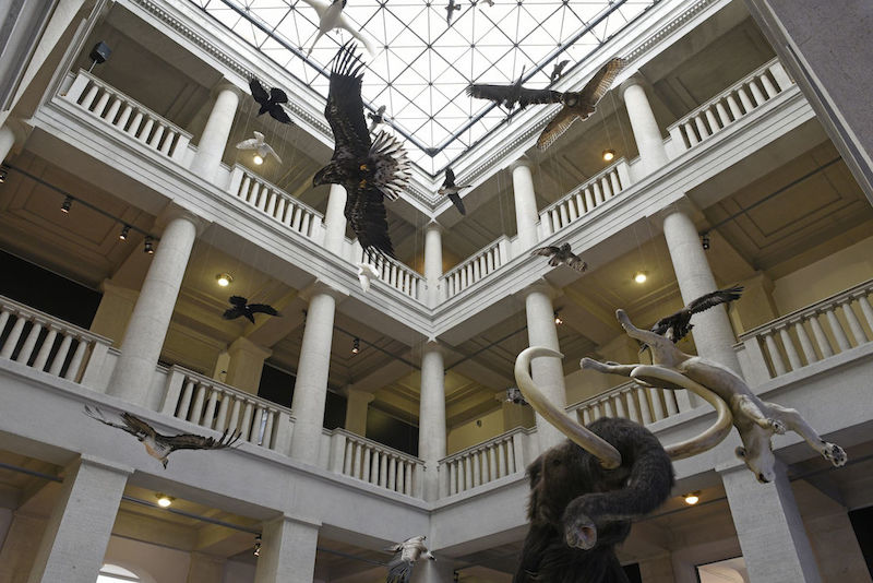 Auch die Vogelpräparate im Atrium wurden extra für die Ausstellung neu angefertigt. Dafür nutzte Steinheimer seine Netzwerke und kontaktierte europäische Naturkundemuseen und Organisationen mit der Bitte, ihm das nächste verstorbene Tier der gewünschten Art zu überlassen. „Als ich dann alle beisammen hatte, mussten die Vögel noch konserviert werden. Das haben drei deutschen Präparatoren mit Weltmeistertiteln in Vogelpräparation übernommen“, sagt er. Insgesamt ein Jahr dauerte es, bis Steinheimer alle Tiere organisiert hatte. Beim Aufhängen der Vögel im Museum half Hans-Jürgen Altner vom ZNS, der als Präparator für die Zoologische Sammlung einen geschulten Blick dafür hat, wie die Vögel im Flug positioniert sein müssen.
