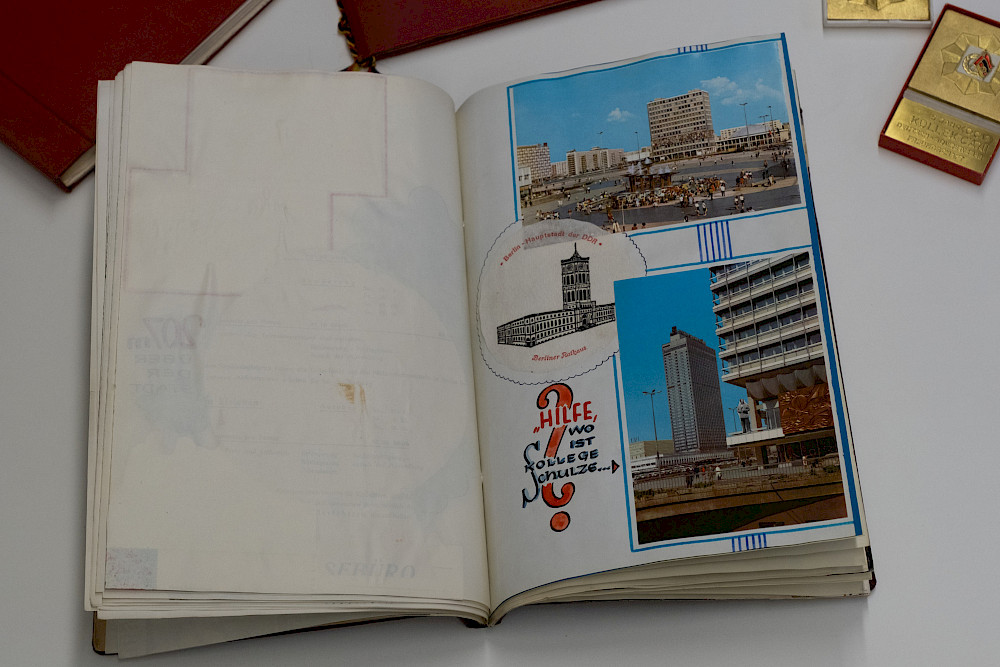 Das Brigadebuch der Gruppe „Düngung“ begann im Frühjahr 1974. Die 16-köpfige Gruppe gehörte zur Landwirtschaftlichen Fakultät der MLU und trug den Titel „Kollektiv der sozialistischen Arbeit“. Zu den Ereignissen, die 1974 Eingang in das Buch fanden, gehörte unter anderem der Besuch einer Revue am 9. Januar, der Rosenmontag im Februar sowie eine Feier für die Frauen am 25. März, die im Heide-Krug stattfand und bei der die Teilnehmenden „nach anfänglichen Schwierigkeiten“, so liest man, „doch noch einen schönen Platz im ‚Grünen Salon‘ erhielten“. Die Seiten zu den einzelnen Aktivitäten sind aufwändig gestaltet: Aufgeklebte Zeitungsausschnitte, oft ergänzt durch Zeichnungen, farbig herausgehobene Überschriften, aber auch ganze Foto-Collagen reihen sich aneinander. „Man sieht, dass da jemand wirklich Spaß an der Gestaltung hatte“, sagt Karin Keller, stellvertretende Leiterin des Universitätsarchivs der MLU.
