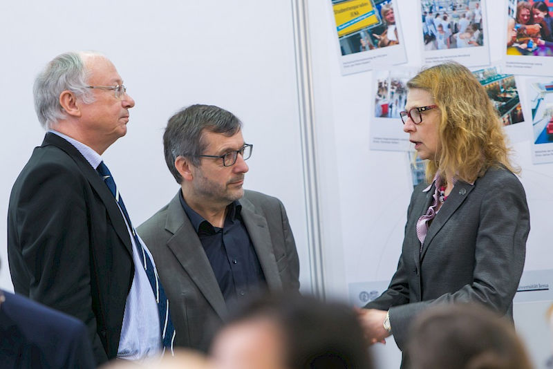 Das Gespräch sollte abschließend aber auch dazu dienen, die Zusammenarbeit der drei Partner im Unibund darzustellen. Im Fokus stand hier die Zusammenarbeit im Deutschen Zentrum für integrative Biodiversitätsforschung (iDiv) Halle-Jena-Leipzig. „iDiv, das ist das ganz große Ding. Im Grunde ist es ein Exzellenzcluster, nur finanziell besser ausgestattet“, sagte Udo Sträter. Immerhin sei es ein von der Deutschen Forschungsgemeinschaft gefördertes nationales Forschungszentrum. Rektorin Schücking verwies auch auf den gemeinsamen Exzellenzantrag, der nun auf den Weg gebracht sei und sich aus der Forschung des gemeinsamen „Forum for the Study of the Global Condition“ speist. Und Walter Rosenthal schloss mit NutriCard, ein gemeinsames Kompetenzcluster, das sich mit der Entwicklung gesunder Nahrungsmittel befasst.