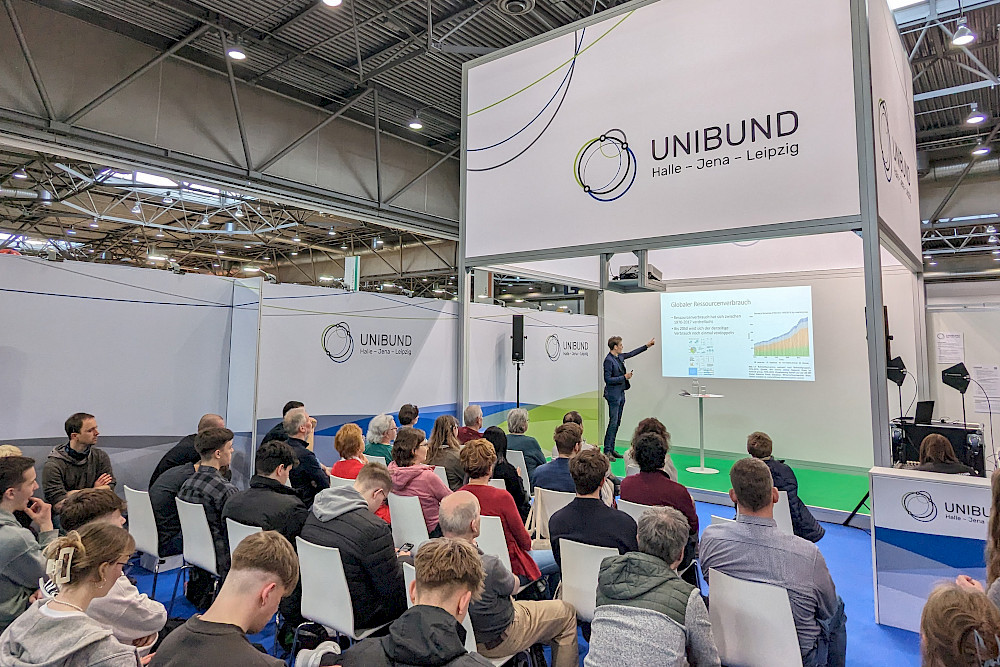 Seit heute präsentiert sich die Universität Halle gemeinsam mit ihren Partnerhochschulen Jena und Leipzig auf der Leipziger Buchmesse. Insgesamt 20 Veranstaltungen bietet das „Forum UNIBUND“ interessierten Besucherinnen und Besucher bis Sonntag an. Für die Universität Halle sprach zum Auftakt der Politikwissenschaftler Dr. Jasper Finkeldey unter dem Titel „Wirtschaftskriege oder Kreislaufwirtschaft - Wohin steuert die globale Ressourcenpolitik?“ über politische Diskussionen um knappe Ressourcen.
