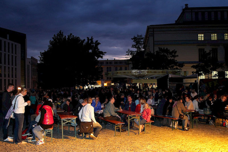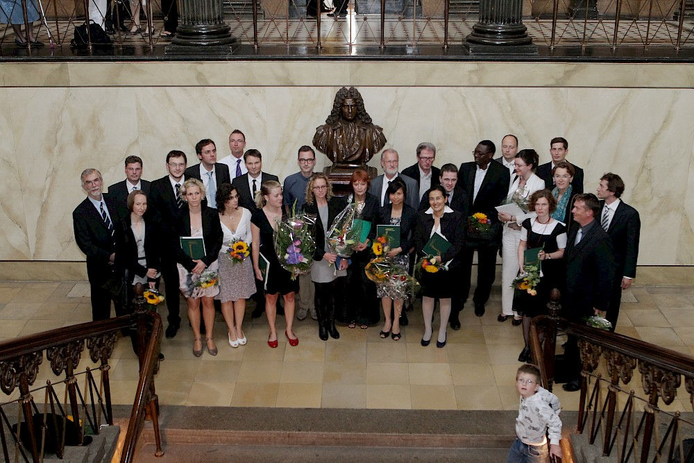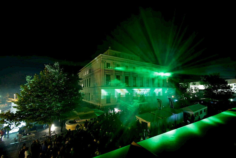 Draußen auf dem Universitätsplatz sprach derweil der Rektor, es wurden mit frenetischem Jubel die Fußball-Europameister gefeiert, es gab viele Showeinlagen – und als Höhepunkt begeisterte die fulminante 3D-Lasershow zur Geschichte der Evolution das Publikum. Noch mehr Zuschauer zog an diesem Abend nur das große Feuerwerk auf dem Von-Seckendorff-Platz an. Eine Viertelstunde voller blauer Wasserfälle und Fontänen hatte Informatikprofessor Stefan Brass mit seiner selbstprogrammierten Zündanlage komponiert.