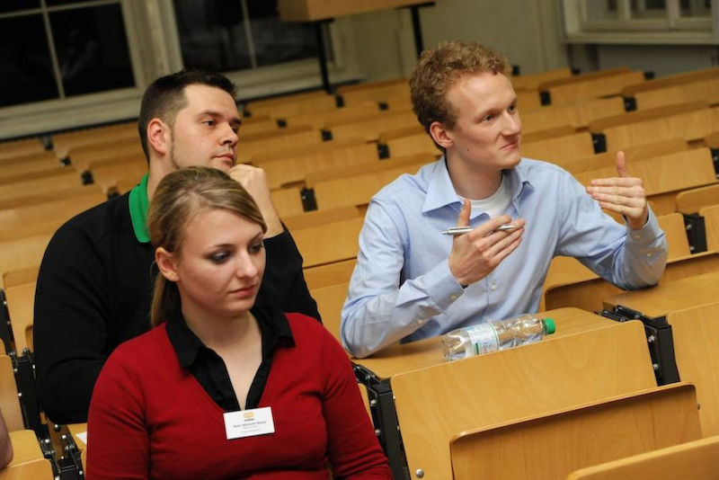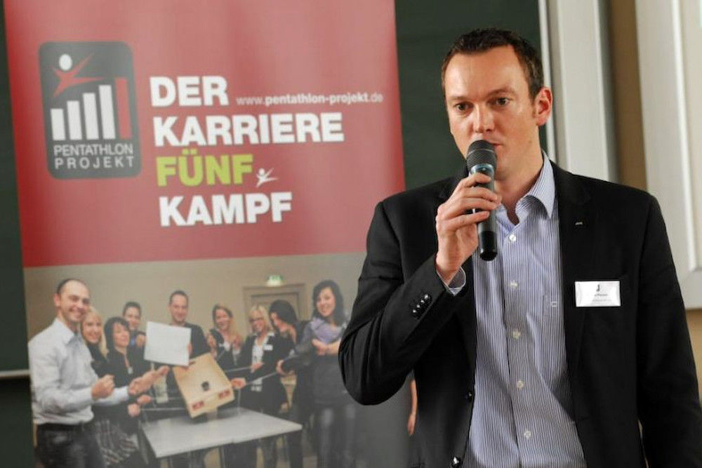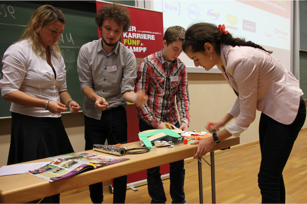 Um uns herum klickt unentwegt der Auslöser von Christiane Krohes Spiegelreflexkamera. Sie ist Mitarbeiterin im Personalmanagement der Witt-Gruppe, einem europaweit agierenden Textilversandhändler, dessen rotes, an ein Wollknäuel erinnerndes Logo auf meinem Namensschild prangt. Zusammen mit ihrer Kollegin Katharina Steffen begleitet sie uns den Tag hindurch – und bewertet uns. Denn wer sich beim Pentathlon, dem „Karriere-Wettkampf“, am besten schlägt, dem winkt ein gemeinsames Abendessen mit den Vertretern der diesjährigen Pentathlon-Partner – BUW, Dell, EnviaM, die Günter Papenburg AG, itCampus, Schiffl und Witt – und die Chance auf Praktikum oder Berufseinstieg.