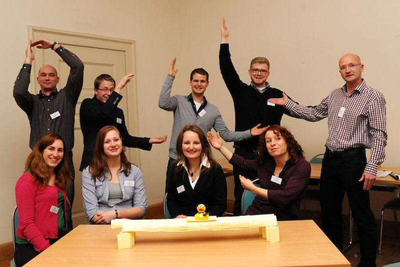Eine Brücke zwischen Studierenden und Unternehmen will das Pentathlon Projekt bauen, haben uns die Projekt-Initiatoren erklärt. Und eine Brücke bauen müssen auch wir, um bei diesem Fünfkampf zu punkten. Aus Karteikarten. Das kann doch wohl nicht so schwer sein, denke ich mir. Immerhin habe ich schon als Kind mehretagige Kartenhäuser errichtet. Doch halt! 70 Zentimeter Spannweite soll sie haben und die Last einer Wasserflasche tragen können, liest Yvonne von dem schon sichtlich abgegriffenen Aufgabenblatt mit Pentathlon-Logo ab. Die gelernte Bankkauffrau und BWL-Studentin legt die Stirn in Falten. Die gelben A6-Bögen einfach aneinanderzukleben, hat sich damit wohl erübrigt – und wir haben weder Statiker noch Ingenieure unter uns.