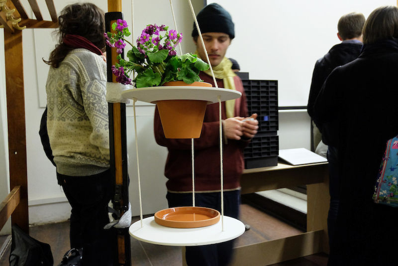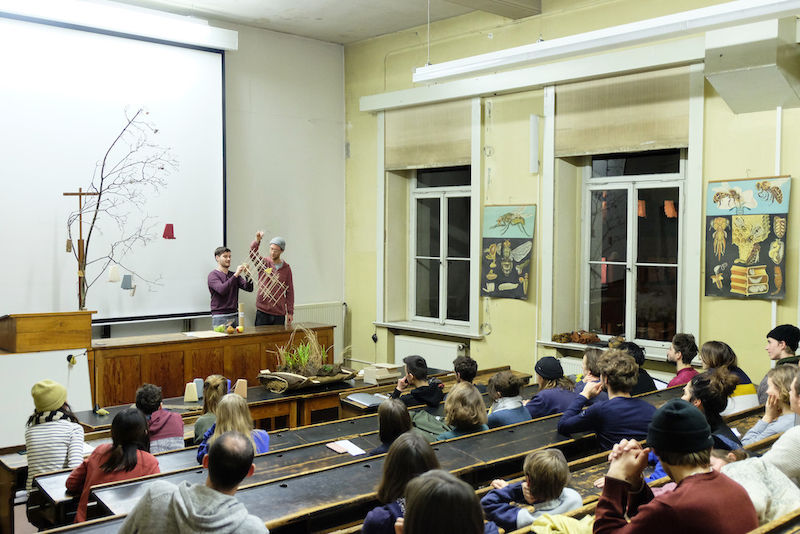 Dienstagabend, 18 Uhr. Der Hörsaal im Gebäude des Zentralmagazins Naturwissenschaftlicher Sammlungen (ZNS) ist gut gefüllt. Diesmal sind es keine Biologie-Studierenden der halleschen Universität, die die Bänke einnehmen, sondern Design-Studierende der Burg Giebichenstein Kunsthochschule Halle. Warum sie gekommen sind, lässt ein im Raum stehender Zweig vermuten, an dem mehrere verschiedenfarbige Vogelfutterspender hängen. An diesem Abend präsentieren die Studierenden neue Ideen für sinnvolle Fütterung oder Vogelhäuser.