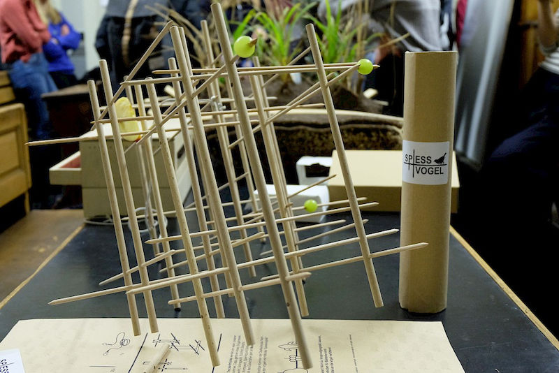 „Wir wollten etwas Modulartiges, Veränderbares schaffen, mit dem jeder selbst aktiv werden kann“, sagt der Student Robert Walther, der mit seinem Kommilitonen Jonas Heimann zusammengearbeitet hat. „Deshalb haben wir den ‚Spießvogel‘ entwickelt, ein aufhängbares Stecksystem, auf das man Früchte spießen kann und auf das sich die Vögel setzen können. Wir wollten uns mit der Idee vom langweiligen Vogelhaus lösen und hoffen, dass sich dadurch auch Kinder und Jugendliche wieder mehr mit dem Thema beschäftigen.“