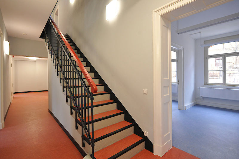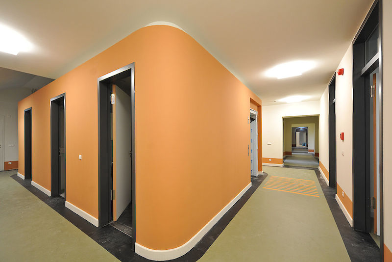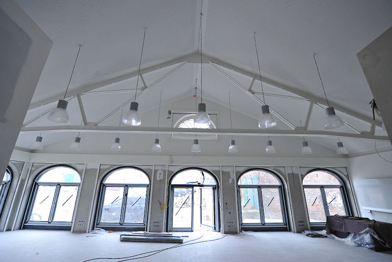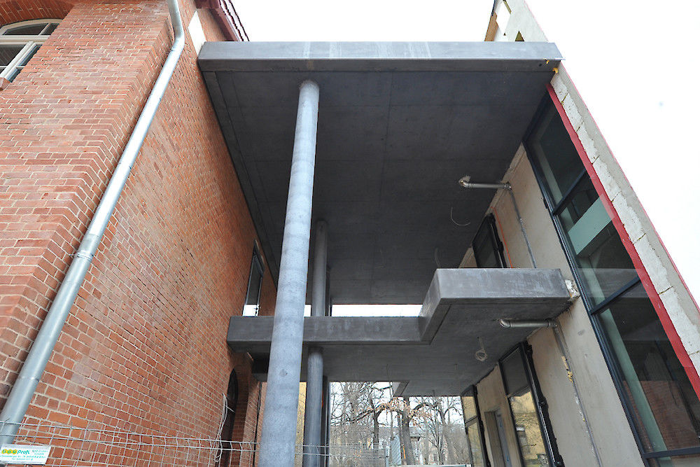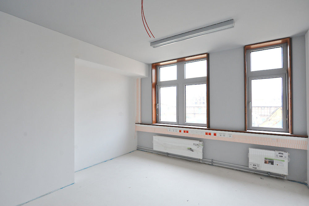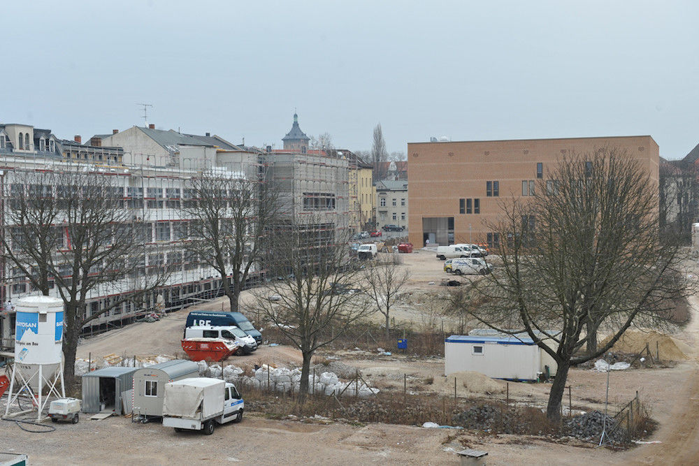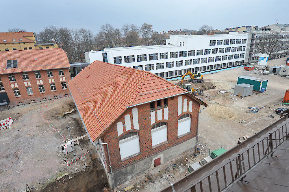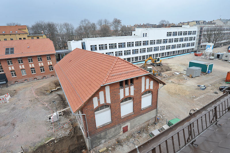 Viel Kraft brauchen Besucher des neuen Steintor-Campus schon nicht mehr, um sich vorstellen zu können, wie hier in eineinhalb Jahren rund 3.000 Studierende und 350 Mitarbeiter der Uni lernen, lehren und forschen werden. Die Bibliothek, die Hörsäle, die Büros und Aufenthaltsräume nehmen Gestalt an. Zwischen Ludwig-Wucherer-Straße, Steintor, Emil-Abderhalden-Straße und Adam-Kuckhoff-Straße wird der Innenausbau vorangetrieben, werden Kabel und Fußböden verlegt, wird verputzt und gemalert. Die Gestaltung der Außenanlagen hat ebenfalls begonnen .