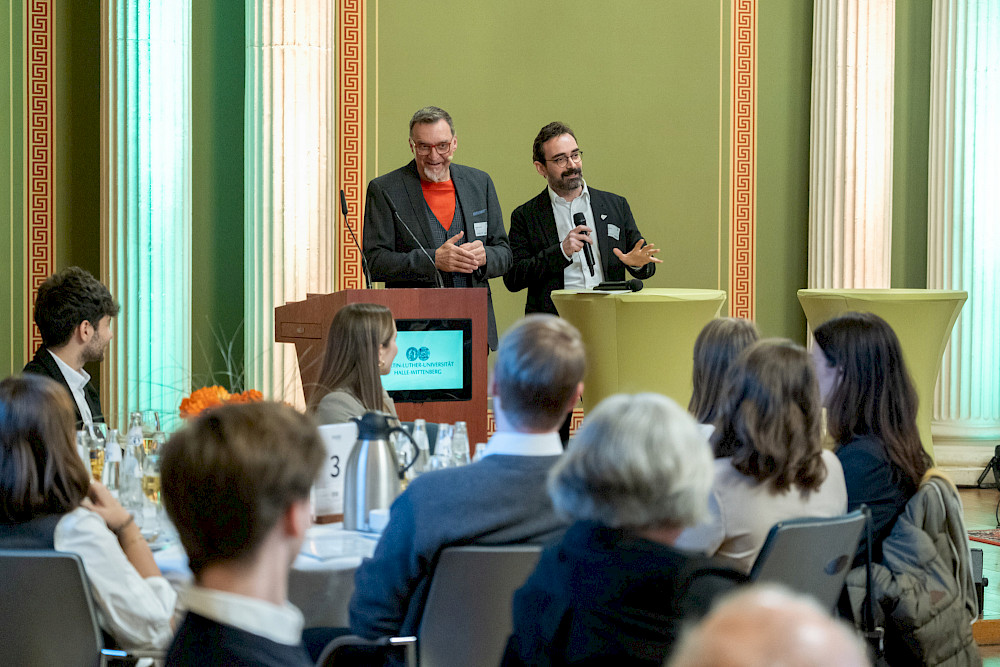 Letzteres sorgte für einen thematischen Fokus bei der diesjährigen Deutschlandstipendien-Vergabe. Germanist Dr. Nico Elste berichtete im Interview mit dem Moderator der Veranstaltung Gerald Perschke, Journalist und selbst Förderer, zum Beispiel aus der Geschichte seines Fachs. In einem kurzweiligen Frage-Antwort-Spiel unterzog Elste die Gäste zudem per Umfragetool einem kleinen Rechtschreib- und Grammatiktest, natürlich inklusive anschließender Erklärungen. So erfuhren die Anwesenden auch, wie hoch der Anteil von „Bauchkommatasetzern“ ist, welche Tücken die deutsche Sprache für Schülerinnen und Schüler bereithält und was das alles für die Ausbildung von künftigen Lehrerinnen und Lehrern an der MLU bedeutet.