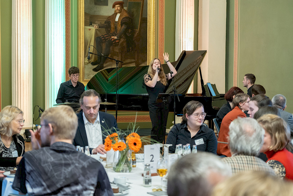 Die Rektorin zog in ihrem Grußwort nicht nur eine Bilanz zum Deutschlandstipendium an der MLU. Sie verwies auch auf das bundesweiten Netzwerktreffen der jeweiligen Verantwortlichen aus den Hochschulen, das im Juni an der MLU stattfand, und einige universitäre Highlights dieses Jahres. Dazu zählten die Bewilligung eines Exzellenzclusters ebenso wie die Auftaktveranstaltungen der großen Strukturwandel-Verbundvorhaben und des Graduiertenkollegs „Politik der Aufklärung“, aber auch die Projektwoche „In Verteidigung der Demokratie“ oder Jubiläen wie das 150-jährige Bestehen des Instituts für Geschichte und des Germanistischen Instituts.