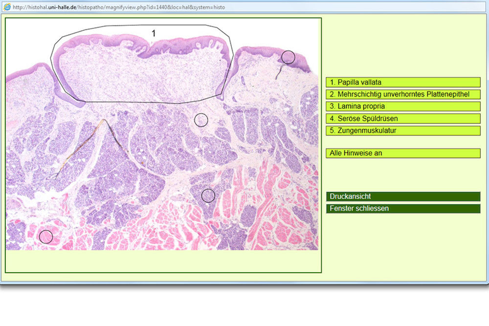 Mit wenigen Mausklicks können sich die Benutzer für jedes Präparat zusätzliche Hinweise und Beschriftungen anzeigen lassen. So können die Studenten zuerst schauen, ob sie die wichtigen Strukturen im Gewebebild selbst erkennen können, ohne dass diese durch das Programm sofort angezeigt werden. Die Nutzung ist sogar während der Arbeit mit dem Mikroskop sehr hilfreich. „Die unterschiedlichen Präparate können nämlich voneinander abweichen. So lernen die Studenten, Unterschiede in den Strukturen zu erkennen und hinterfragen bestehende Präparate kritischer“, ergänzt Dehghani.