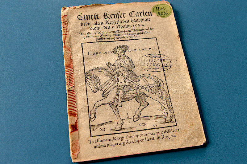 Das Werk aus der Reformationszeit umfasst nur 16 Seiten, der Titel ist zeitgemäß und klingt heute etwas sperrig: „Einrit Keyser Carlen || in die alten Keyserlichen haubtstatt || Rom/ den 5 Aprilis. 1536“. Die erste Seite jedoch ist mit einem schönen Holzschnitt verziert, der den habsburgischen Kaiser Karl V. zu Pferde zeigt. Die Geschichte des Heftchens ist schnell erzählt: Karl ist 1536 Kaiser des Heiligen Römischen Reiches und er will in Rom den Papst treffen. Da er gerade in Tunis die Osmanen besiegt hat, gerät der Ritt durch Rom zum Triumphzug. Das ist in der kleinen Flugschrift, die Aktuelles bezahlbar verbreiten soll, anschaulich beschrieben.