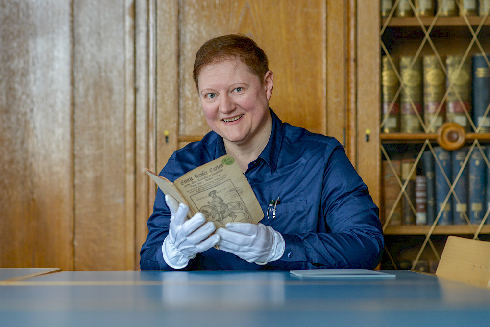 Die Bibliotheca Ponickaviana, das sind 16.000 Bände, 30.000 Kleinschriften plus Handschriften, Kupferstiche und Landkarten. Dass da etwas fehlte? Bis zum 26. Dezember 2022 und einer weihnachtlichen E-Mail aus Thüringen wusste das auch Dr. Julia Knödler, Leiterin der Historischen Sammlungen der ULB, nicht. „Ein Kollege aus Gotha hat Antiquariatskataloge studiert und ihm fiel auf, dass eines der Angebote einen Stempel trug, auf dem eben ganz deutlich zu lesen war: ‚Bibliotheca Ponickaviana‘:“ Was man in Pennsylvania, USA, wo der Antiquar sein Geschäft betreibt, lediglich für eine Adelsprovenienz hielt, jedoch nicht für einen Bibliotheksstempel. Für 3.000 Dollar war die Schrift dort im Angebot. Eine E-Mail an den Händler jedoch reichte aus, den Irrtum aufzuklären. „Anstandslos und schnell wurde das Heft an uns geschickt“, sagt Julia Knödler. Natürlich ohne eine Rechnung auszustellen.