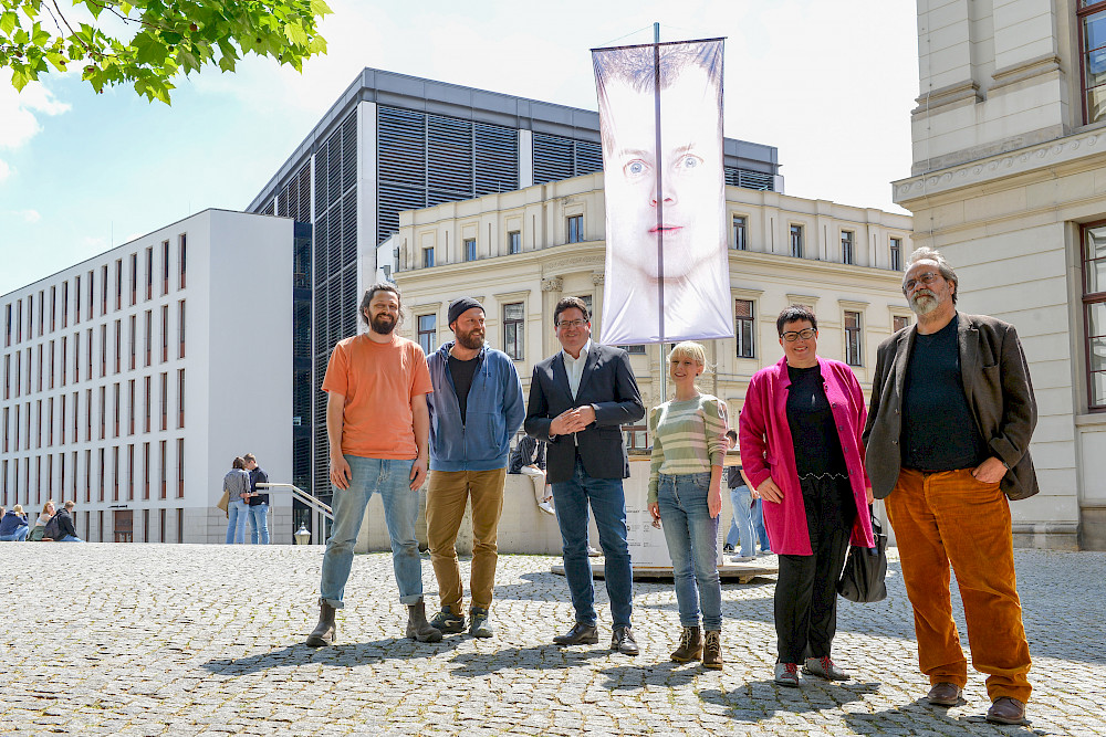 Für die Einweihung der Emotionspunkte fiel die Wahl auf den Universitätsplatz. „Eigentlich könnte man sagen, dass Emotionen am Ort der Wissenschaft nichts zu suchen haben. Aber das stimmt nicht, Wissenschaftlerinnen und Wissenschaftler werden von Emotionen angetrieben“, so Rektor Prof. Dr. Christian Tietje zur Vorstellung der temporäre Bauwerke am Donnerstagnachmittag, bei der auch Matthias Brenner vom neuen theater und Stadtmuseums-Direktorin Jane Unger – beide sind Intendanten des Themenjahres – sowie die Künstler des „Kollektiv Plus X“ anwesend waren.