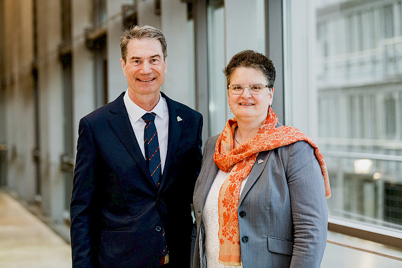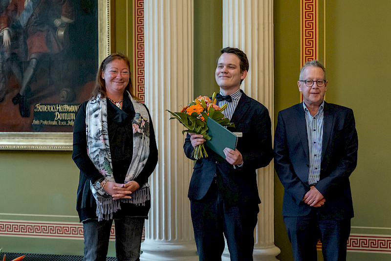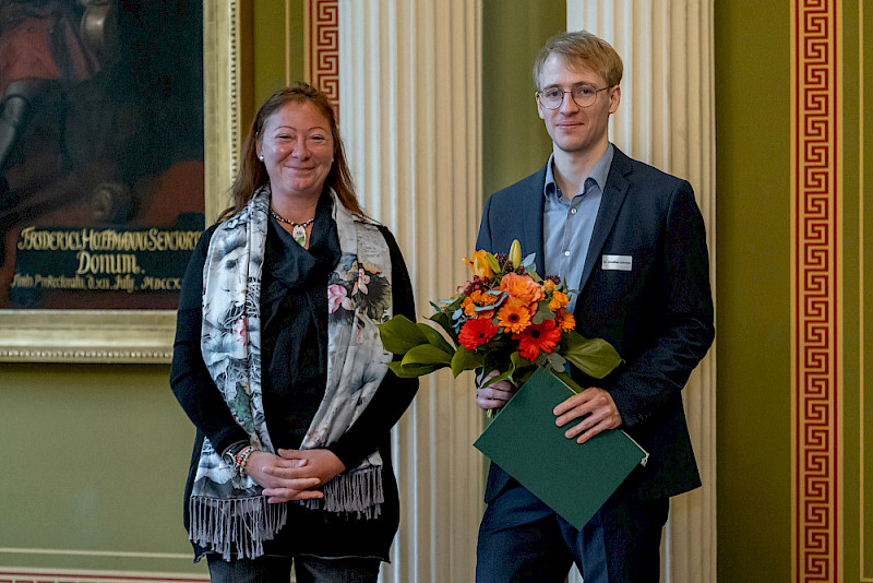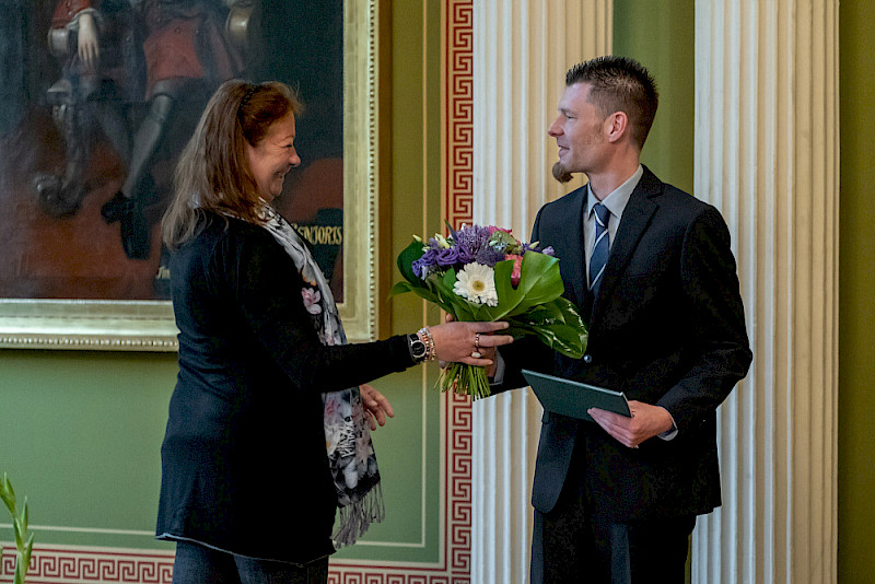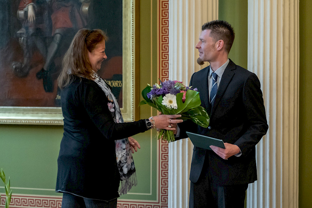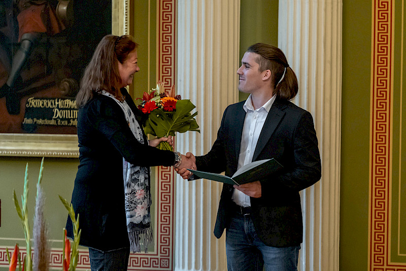 Identifikation mit der MLU sei aber neben dem Thema Transformation ein ebenso wichtiges Anliegen, so die Rektorin. An diesem Abend hatten alle Gäste der MLU bereits beim Einlass einen kleinen Pin erhalten, der abstrahiert den Universitätsplatz von oben zeigt und den Schriftzug MLU trägt. Claudia Becker warb dafür, den Pin auch zu tragen: „Ich selbst habe dieses kleine Schmuckstück schon seit einer ganzen Weile ‚probegetragen‘ und viele neidvolle Blicke geerntet.“ Dem Identifikationsgedanken stimmte auch der Präsident der Vereinigung der Freunde und Förderer der MLU (VFF) Dr. Ralf-Torsten Speler zu, der mit seiner Organisation großzügig den Empfang und das folgende Konzert ermöglichte. Er übergab seine Lebenserinnerungen als Kustos der Universität – und damit jahrzehntelange Universitätsgeschichte – an die Rektorin. Und fasste es schließlich wie gewohnt zusammen: Die Universität, sie möge leben, blühen und gedeihen! - vivat, crescat, floreat!