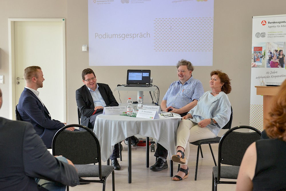Zur Zusammenarbeit gehört heute nicht nur die Beteiligung der Agentur für Arbeit an universitären Veranstaltungen wie dem Hochschulinformationstag, der Gründerwoche oder der Firmenkontaktmesse „campus meets companies“. Dazu zählen auch Netzwerkarbeit zur Beratung von Studienzweiflern, internationalen Studierenden und Geflüchteten, gemeinsame Veranstaltungen für Studierende oder Schüler, die wöchentliche Beratungsstunde des Hochschulteams der Arbeitsagentur an der MLU oder das 2010 gegründete und in den ersten zwei Jahren von der Agentur kofinanzierte Schulbüro Prologe. Ein weiterer Aspekt der Kooperation: Mitarbeiterinnen und Mitarbeiter der Agentur wurden im Anschluss an die Jubiläumsfeier in Sachen Lehrerbildung geschult. Der Direktor des Zentrums für Lehrerbildung an der MLU Prof. Dr. Thomas Bremer verwies in einem kurzen Podiumsgespräch unter anderem auf die Rolle von Quereinsteigern in Zeiten des Lehrermangels.
