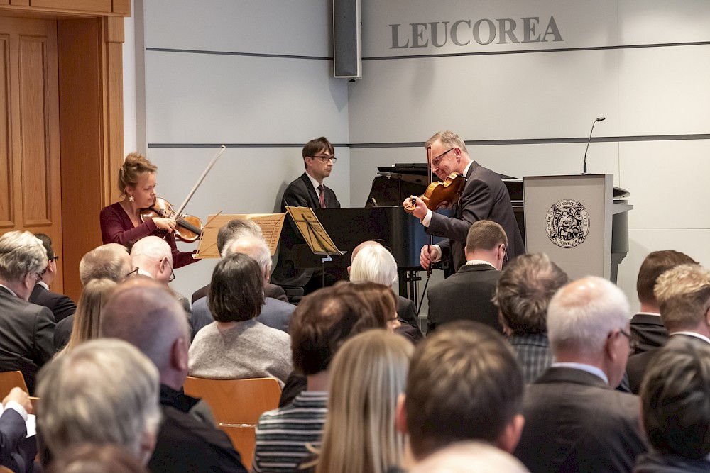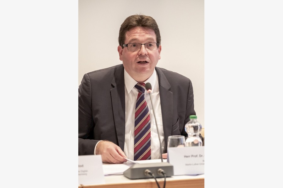 Oberbürgermeister Zugehör begrüßte die Gäste nach einer „taktisch klugen Pause“ – anlässlich des 200. Jubiläums der Vereinigung der Universitäten Halle und Wittenberg fand die Disputation im Jahr 2017 ausnahmsweise in der Aula des Löwengebäudes in Halle statt – wieder in der Lutherstadt. Rektor Prof. Dr. Christian Tietje eröffnete im Anschluss das Streitgespräch. Als zentrales Element der Universität sei die Disputation „eine konstitutive Form des gesellschaftlichen Diskurses in der Demokratie“, der auch die Idee der Reformation zugrunde gelegen habe. Sie galt es auch in diesem Jahr wieder durch spannende Diskussionen „mit Leben zu füllen“.