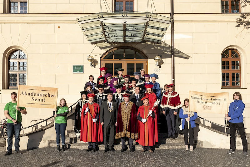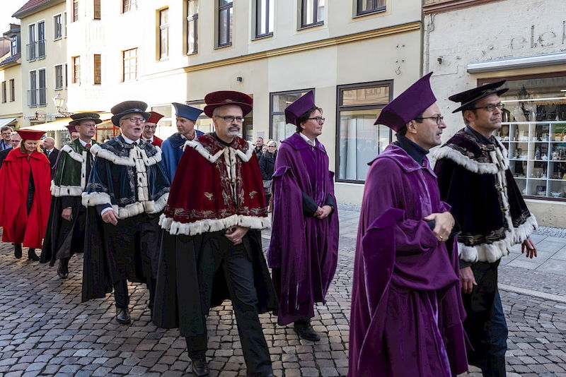 Bei strahlendem Sonnenschein begann der Zug des Akademischen Senats in den historischen Talaren der Universität Halle am Wittenberger Rathaus. Der Marktplatz und die Collegienstraße, durch die es die Angehörigen der Universität bis zur Stiftung Leucorea führte, waren dem goldenen Oktoberwetter entsprechend am Reformationstag gut gefüllt. Für Rektor Prof. Dr. Christian Tietje war es eine Premiere: Erstmals führte er den Zug gemeinsam mit Wittenbergs Oberbürgermeister Torsten Zugehör an.