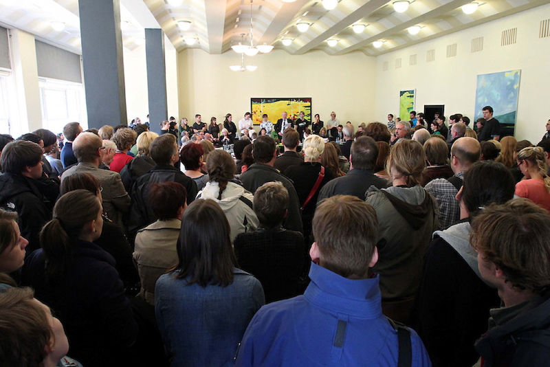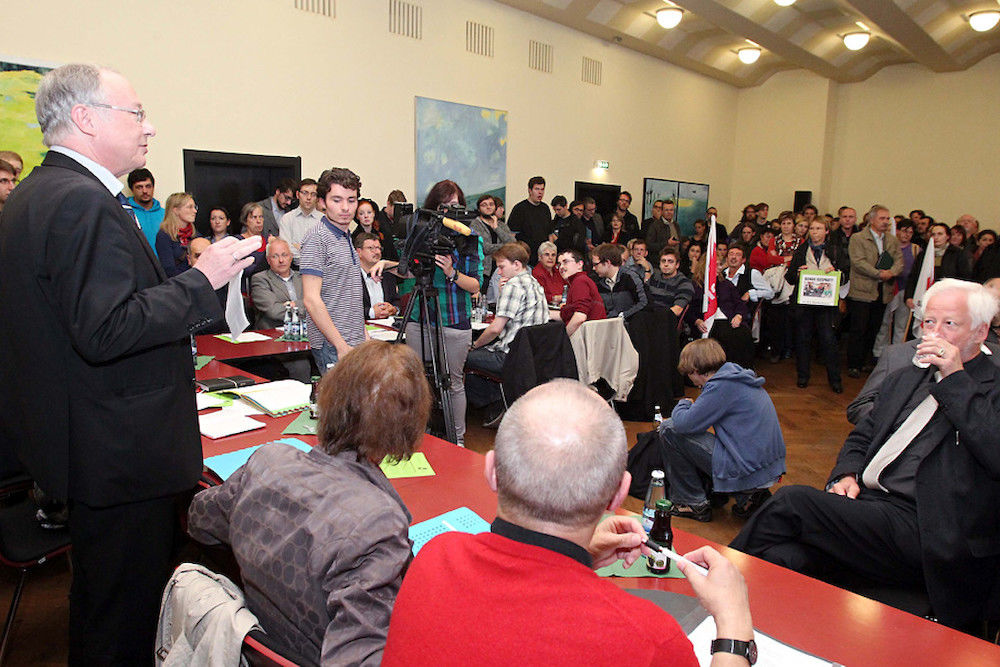 Nicht jeder fand an diesem Nachmittag im „Hallischen Saal“ einen Sitzplatz. Vor allem Studierende waren der Einladung des Aktionsbündnisses gefolgt. Auch Professoren und wissenschaftliche Mitarbeiter kamen zur Sondersitzung. Die Tagesordnung war überschaubar, schnell war der Rektor beim eigentlichen Thema Sitzung angelangt: dem Strukturanpassungskonzept, mit dem die Universität ihr 6 Millionen Euro-Defizit im Haushalt ausgleichen will. Im Juli hatte der Senat das Rektorat damit beauftragt, ein solches Konzept zu erarbeiten.