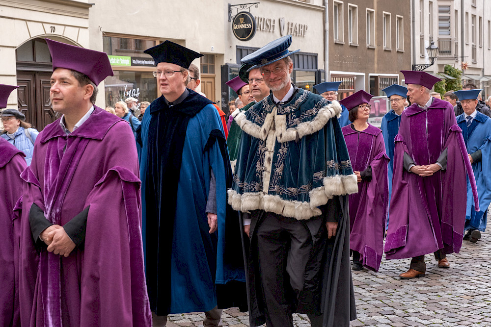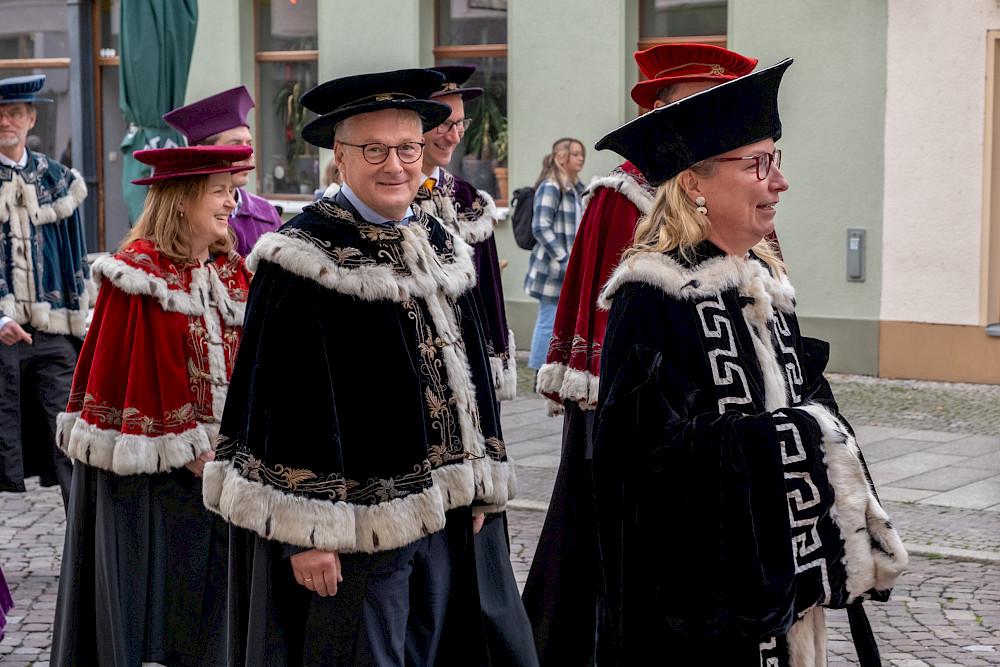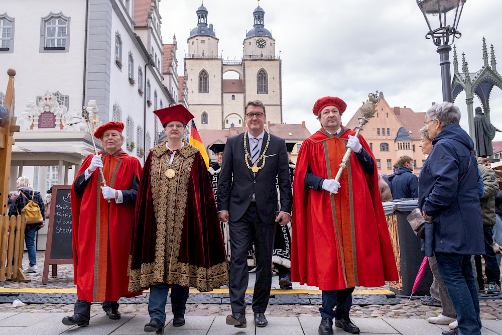 Windig und wolkenverhangen war es, als der Akademische Senat am Reformationstag in seinen historischen Talaren das Wittenberger Rathaus verließ. Angeführt von Rektorin Prof. Dr. Claudia Becker und Wittenbergs Oberbürgermeister Torsten Zugehör zog der Senat vom Marktplatz durch die Collegienstraße zur Stiftung Leucorea. Dort fand zum 29. Mal die traditionelle Disputation der Universität statt.