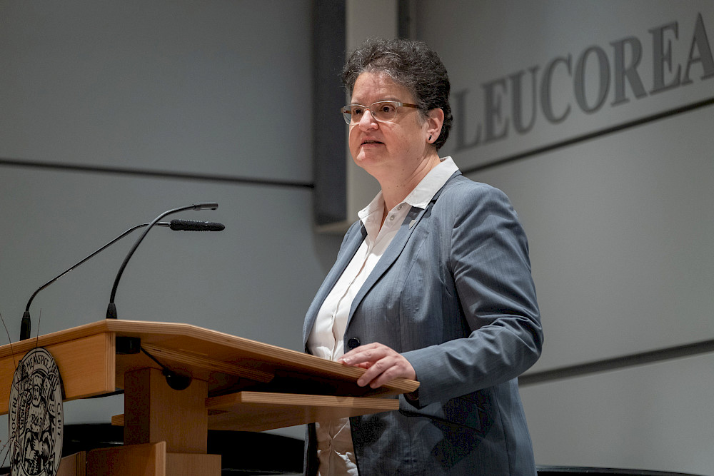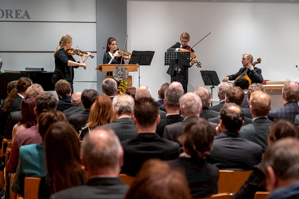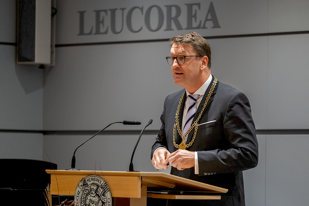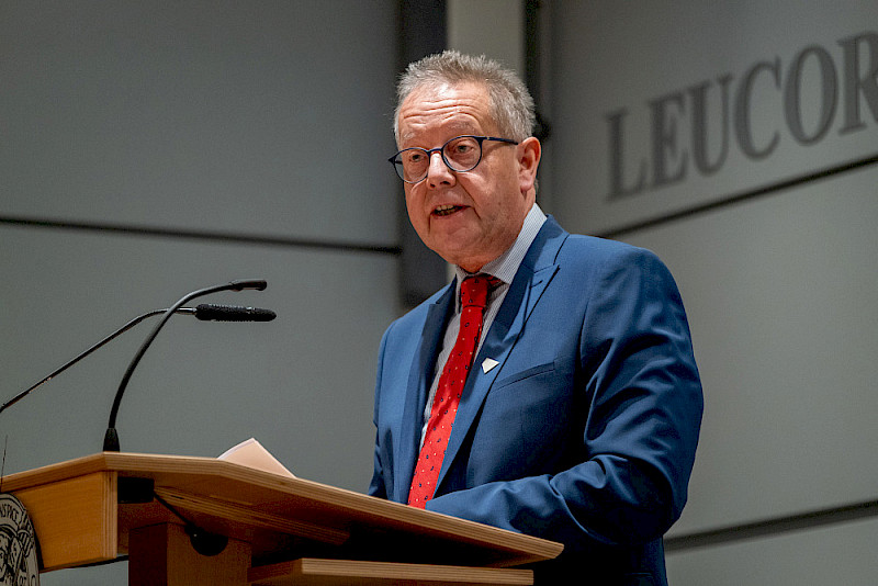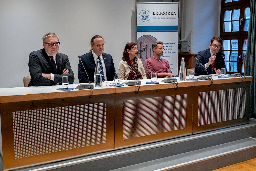 Das diesjährige Thema der von Prof. Dr. Winfried Kluth moderierten Disputation – Künstliche Intelligenz – wurde bereits in der musikalischen Eröffnung durch Mitglieder des Akademischen Orchesters aufgegriffen. Sie spielten eine Fuge von Bach, gefolgt von einer Fuge, die von der KI namens „MuseNet“ komponiert wurde. Die Bemerkung von Orchesterleiter Daniel Spogis, dass die KI Schwierigkeiten mit dieser komplexen Form der Musik habe und sie am Ende übermäßig in die Länge ziehe, sorgte für Heiterkeit im Saal. Rektorin Claudia Becker wies in ihrer Begrüßung darauf hin, dass es problematisch sei, wenn es in der Debatte um KI oft nur darum gehe, dass diese vieles vereinfache. KI könne uns zum Beispiel nicht abnehmen, für unsere Werte einzustehen. Dem schloss sich Oberbürgermeister Torsten Zugehör an: „KI ist nicht die Abkürzung für ‘Ich habe Kinderstube‘“. Der Leucorea-Vorsitzende Prof. Dr. Jörg Dierken trug Auszüge aus einem von ChatGPT verfassten Grußwort vor und stellte unter anderem fest, dass ChatGPT Ironie und Augenzwinkern vermissen lasse.