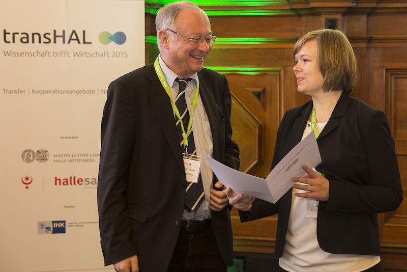 In der Kategorie „Anwendungsorientierte Abschlussarbeiten“ wurde Dr. Diana Döhler vom Institut für Chemie für ihre herausragende Dissertation zum Themengebiet der selbstheilenden Polymere geehrt, die unter anderem im Flugzeugbau Anwendung finden. Martha Wellner, Absolventin im Bereich Ernährungswissenschaften an der MLU, hat sich in ihrer Masterarbeit mit der Herstellung von neuen Süßwarenprodukten beschäftigt und entwickelte eine Krustenpraline mit elastischen Gel-Kern, also im Prinzip ein mit Zuckerkruste umhülltes Gummibärchen. Sie erhielt den Transferpreis in der Kategorie „Anwendungsorientierte Abschlussarbeiten“. Das Preisgeld für beide Arbeiten in Höhe von insgesamt 1.500 Euro wurden von der Stadtwerke Halle GmbH gestiftet.