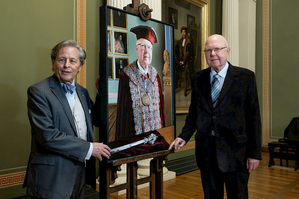 Das Gemälde zeigt den heute 80-jährigen Gunnar Berg im Historischen Sessionssaal vor den Gelehrtenporträts seiner frühen Amtsvorgänger. Er trägt Talar und die einst von Kaiser Wilhelm I. gestiftete Amtskette, vor ihm liegt das Zepter der Wittenberger Universität. Letzteres nehme symbolisch Bezug darauf, dass Berg von 1996 bis 2007 auch Vorsitzender der Stiftung Leucorea in Wittenberg war, erklärt Dr. Ralf-Torsten Speler, Präsident der VFF und ehemaliger Kustos der Uni. Und auch hinter der Amtskette steckt eine Geschichte: Gunnar Berg ist in der Reihe der Rektorenporträts nach vielen Jahren der erste, der sie wieder trägt. Eine Kette vom Kaiser „tragen wir nicht in einer sozialistischen Republik“, hatte es zu DDR-Zeiten noch geheißen, so Speler. Für die Porträts habe der damalige Universitätsmaler Ullrich Bewersdorff deshalb eigens eine andere Kette anfertigen lassen. Aufwändig vergoldet und mit farbigen, synthetischen Edelsteinen aus Bitterfeld besetzt, zeigte sie auf der einen Seite den Juristen und Philosophen Christian Thomasius als einen der Gründungsväter der halleschen Universität und auf der anderen das Siegel der Wittenberger Universität. Politisch war das offensichtlich unverdächtig. Die Kette, erinnert sich Speler, war auch durchaus repräsentativ, so dass sich 1990 mit Günther Schilling der erste frei gewählte Rektor nach der friedlichen Revolution ebenfalls noch für sie entschied. Aber sie war eben nicht das Original.