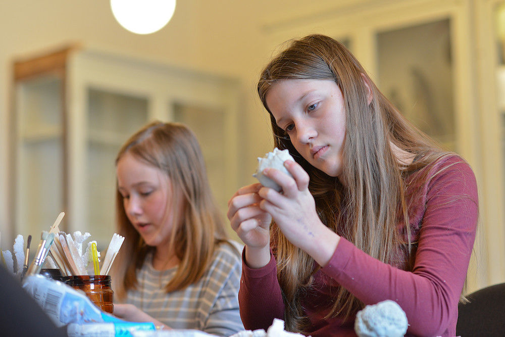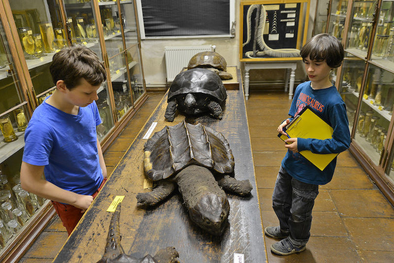 Die Entscheidung fiel den Freundinnen leicht: „Wir mögen beide das Meer“, sagt Anastasia. Und sie kennen es gut. „Ich war schon oft Schnorcheln“, erzählt Maria. Ihre Freundin ergänzt: „Wir haben auch schon viele Dokumentarfilme gesehen – über das bedrohte Great Barrier Reef zum Beispiel“. Gemeinsam mit der Kustodin der Zoologischen Sammlung Dr. Karla Schneider stehen die beiden Mädchen vor einer Vitrinen, auf der Suche nach Meerestieren, die mit Ton nachgebaut werden könnten. Sie inspizieren die Feuerkoralle und staunen über ein Stück Haihaut – „wie cool!“. „Die Kinder bringen eigene Interessen mit. Sie können sich frei in den Räumen bewegen und suchen sich ihre Forschungsthemen selbst“, so Arila Perl, die als Museumspädagogin die Kinder betreut. „Wir geben ihnen den Raum, die Sammlungen zu entdecken und selbst das auszuwählen, was sie zum Beispiel an die anderen Besucher und Schulklassen weitergeben wollen.“