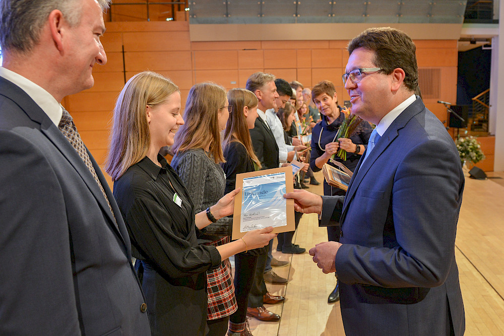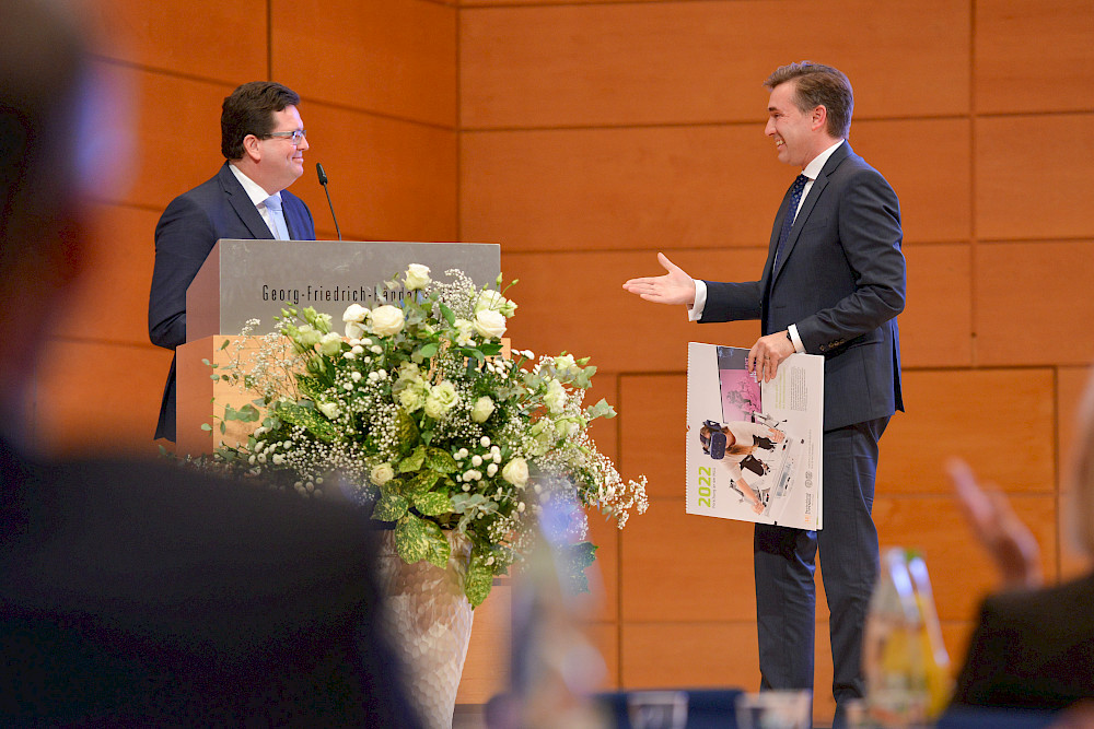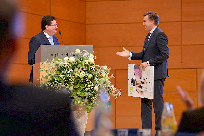 Insgesamt 995 Stipendien konnte die Uni Halle seit dem Start des Programms im Jahr 2011 vergeben, berichtete Rektor Prof. Dr. Christian Tietje in seiner Begrüßungsrede auf der Veranstaltung, die im Gegensatz zu der digitalen Variante im Vorjahr wieder in Präsenz stattfinden konnte. Die Hälfte des Stipendiums in Höhe von monatlich 300 Euro haben verschiedenste Stifter bereitgestellt, den Rest das Bundesministerium für Bildung und Forschung. Insgesamt konnten so 1,791 Millionen allein durch regionale Fördernde und mehr als 3,5 Millionen inklusive des Bundesanteils ausgereicht werden. „Das ist beeindruckend für die Region und die Universität“, so Tietje. Der Rektor erinnerte zum Beispiel an den Start mit 35 Stipendien, die am 12. Oktober 2011 übergeben wurden – damals war er als Dekan dabei. Die einstigen Befürchtungen, ostdeutsche Hochschulen könnten in dem Programm einen Standortnachteil haben, habe die Uni Halle ausräumen können. Mit 120 Stipendien, für die es 468 Bewerbungen gab, wurde jetzt im Jubiläumsjahr wieder ein neuer Rekord aufgestellt. Neben 14 Fördernden, die von Beginn an ohne Unterbrechung dabei sind, kamen in diesem Jahr sechs neue hinzu, so dass die Zahl der Stifterinnen und Stifter aktuell bei 68 liegt. „Sie sind hier ganz besonders aktiv“, konstatierte auch Thomas Wünsch, Staatssekretär im Ministerium für Wissenschaft, Energie, Klimaschutz und Umwelt und selbst Alumnus der MLU.