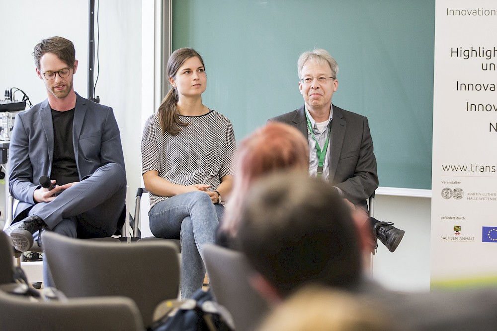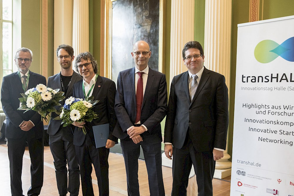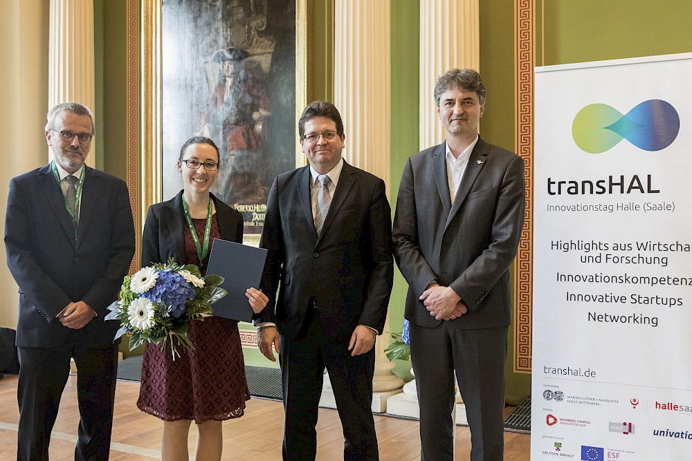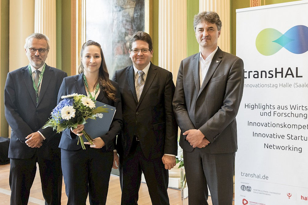 Ausgezeichnet wurden: Materialwissenschaftler PD Dr. Hartmut S. Leipner und Robert Schlegel von der enspring GmbH Halle für smarte Festkörper-Akkumulatoren aus Verbundmaterialien, die deutlich mehr nutzbare Energie speichern können als herkömmliche Batterien. Sie erhielten in der Kategorie „Erfolgreiche regionale Transferkooperation“ den mit 1.000 Euro dotierten Preis der Stadt Halle. Den ebenfalls mit 1.000 Euro dotierten Preis in der Kategorie „Anwendungsorientierte Dissertation“ erhielt die Biochemikerin Dr. Mandy Gebauer für ihre Arbeit über die Entwicklung neuartiger Impfstoffe gegen das Influenza-A-Virus in Tieren. Ihre Ergebnisse trugen zu der erfolgreichen Ausgründung des Spin-off-Unternehmens Verovaccines bei. Der Preis wurde von den Stadtwerken Halle gestiftet. Den mit 500 Euro dotierten Preis in der Kategorie „Anwendungsorientierte Masterarbeit“ erhielt Kathrin Glaß für ihre Masterarbeit über eine leicht umsetzbare Methode für die genaue Dosiskontrolle eines Nuklids, das zum Beispiel bei der Therapie von Prostatakarzinomen eingesetzt wird. Das Preisgeld für die Auszeichnung stifteten ebenfalls die Stadtwerke Halle.