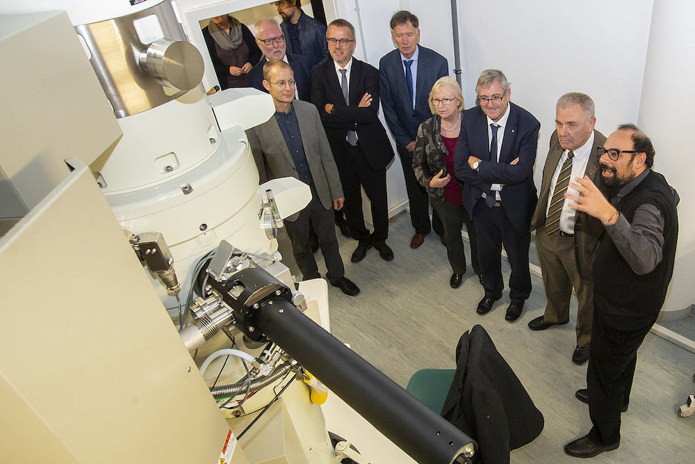 Eine vielversprechende Anlaufstelle für künftige Spitzenforschung hat der ERC-Präsident sich im Anschluss an den informellen Austausch angeschaut: das Charles-Tanford-Proteinzentrum der Universität Halle. Der Biotechnologe Prof. Dr. Milton Stubbs, Sprecher des Zentrums, gab zunächst einen kurzen Überblick über die Geschichte der halleschen Proteinforschung, die Entstehung des neuen Proteinzentrums und über aktuelle Forschungsvorhaben, die von der Tumorbiologie bis hin zur künstlichen Erzeugung neuer Proteine reichen. Anschließend präsentierten vor allem Nachwuchsgruppen aus der Proteinforschung ihre Arbeit: Jun.-Prof. Dr. Carla Schmidt erklärte, wie sich mit Hilfe von modernen Massenspektrometern Membranproteine untersuchen lassen. Die Kryo-Elektronenmikroskopie, mit der Proteine im Größenbereich einzelner Atome untersucht werden können, stellte Jun.-Prof. Dr. Panagiotis Kastritis vor, der den ERC-Präsident kurzerhand selbst eine Mikroskopie-Aufnahme durchführen ließ. Zum Abschluss präsentierte sich die „Core Facility Imaging“, in der den Arbeitsgruppen des Proteinzentrums zahlreiche moderne Bildaufnahmetechnologien zur Verfügung stehen. Bourguignon lobte während der Führung mehrfach die „faszinierenden Projekte“ der halleschen Forschergruppen.