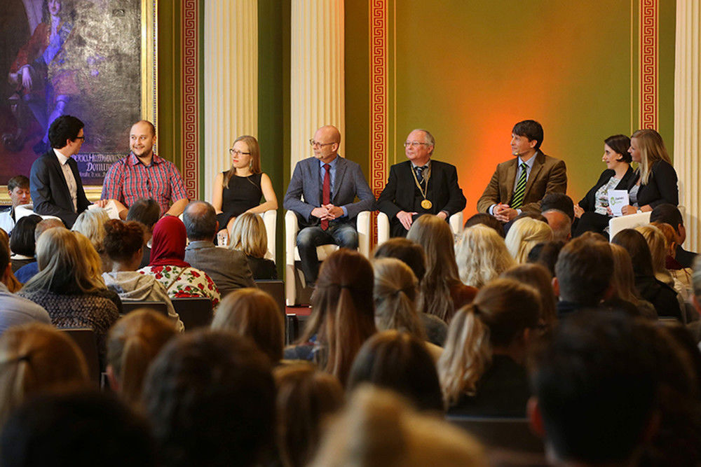 Beim Ersti-Talk in der Uni-Aula waren auch in diesem Jahr die Plätze wieder frühzeitig besetzt. Erstsemester konnten dort ihre Fragen an Rektor Prof. Dr. Udo Sträter, Oberbürgermeister Dr. Bernd Wiegand sowie an Studierende und einen Alumnus stellen. Gleich zu Beginn überraschte der Rektor mit der Aussage: „Zu wichtigen Anlässen wird der Rektor in Ketten gelegt.“ Er verwies damit auf seine Amtskette, die er bei bedeutenden Veranstaltungen trägt. „Die kriege ich abgenommen, sobald ich hier rausgehe, da ich viel zu viel Angst habe, dass ich die versemmle“, witzelt Sträter.