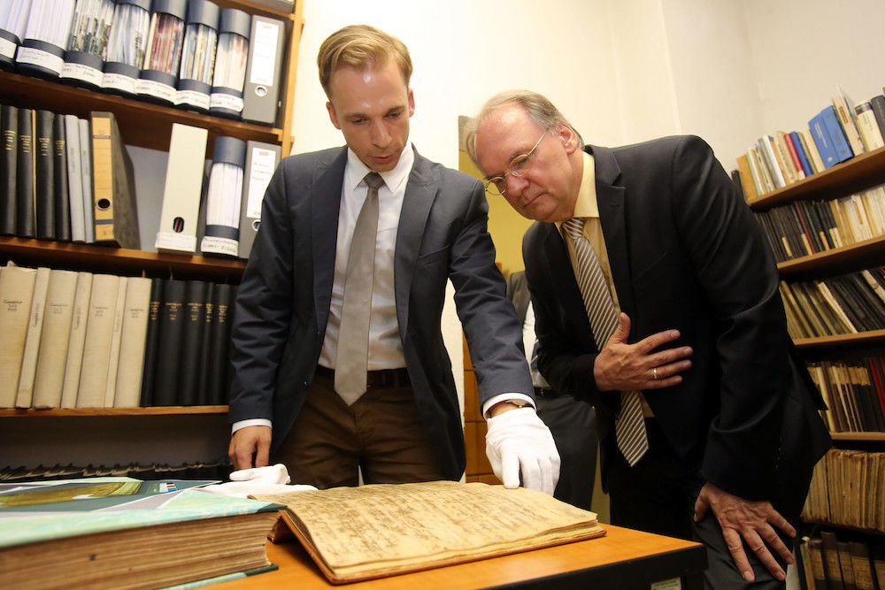 Im Archiv der Universität ließ sich Haseloff ebenfalls von den Archivalien beeindrucken und von Dr. Michael Ruprecht, Leiter des Archivs, über die Bestände informieren. Interessiert zeigte er sich unter anderem am Dekanatsbuch der Philosophischen Fakultät zu Wittenberg, in dessen ersten Band (1503-1554) auch die Promotion von Georg Joachim Rheticus am 27. April 1536 verzeichnet ist. Der Gelehrte und Professor für Mathematik und Astronomie in Wittenberg war unter anderem ein Freund und Schüler von Kopernikus und trug wesentlich zur Verbreitung des heliozentrischen Weltbilds bei.