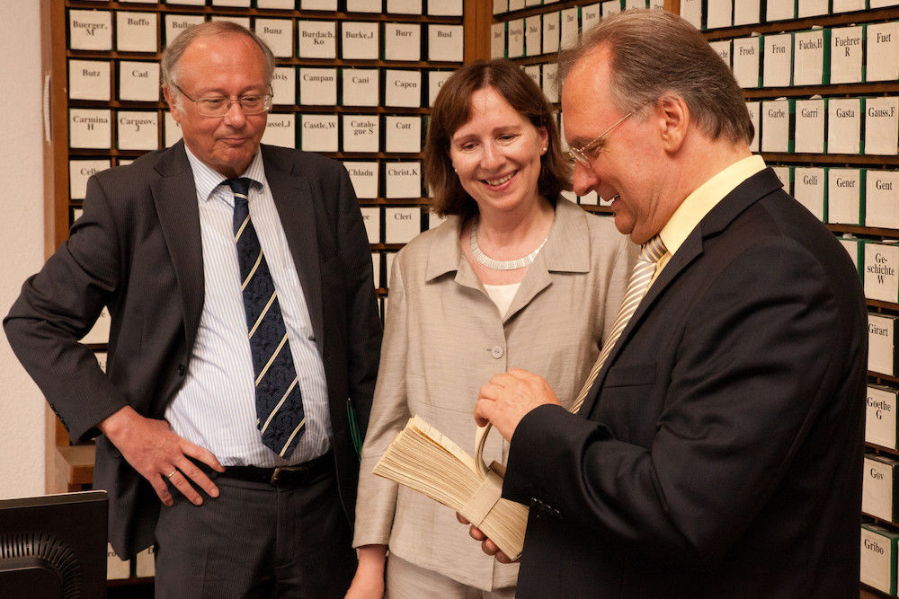 Im Katalograum wurden bis 1929 die eingehenden Bücher handschriftlich verzeichnet und noch bis 1990 wurden Zettelkataloge geführt. Fasziniert von den alten Katalogen und insbesondere vom historischen „Strumpfbandkatalog“, nahm Reiner Haseloff aus einem Regal eines der unzähligen kleinen Kästchen in die Hand. Im Innern der Holzkästen befinden sich Kartenstapel mit handgeschriebenen Eintragungen, die jene Strumpfbänder zusammenhalten. Diese Art der Katalogisierung ist auf den einstmaligen Bibliotheksdirektor Otto Hartwig (1830 bis 1903) zurückzuführen.
