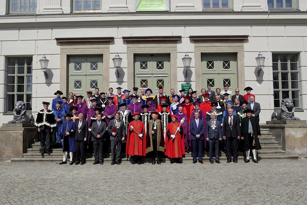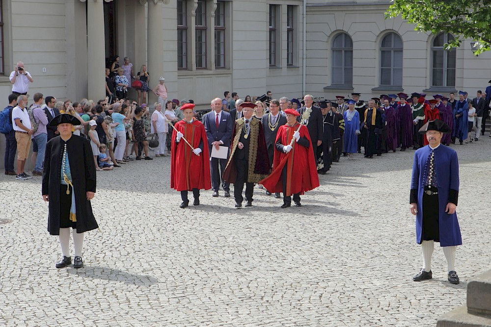 Die lange akademische Tradition der Universitäten Halle und Wittenberg wurde zum Auftakt des Festakts auf dem Universitätsplatz für alle sichtbar: Gemeinsam mit den Oberbürgermeistern und Stadtratsvorsitzenden der Städte Halle und Wittenberg, mit dem Leopoldina-Präsidenten, dem Vizepräsidenten der Sächsischen Akademie der Wissenschaften zu Leipzig und zahlreichen hochrangigen internationalen Gästen zog der Akademischen Senat in seinen historischen Talaren vom Rektoratsgebäude zum Löwengebäude. Halloren der Salzwirkerbrüderschaft im Thale zu Halle flankierten den Zug, Blechbläser des Akademischen Orchesters begleiteten das Ereignis mit barocken Klängen.