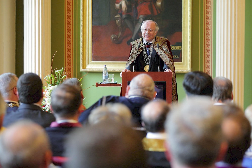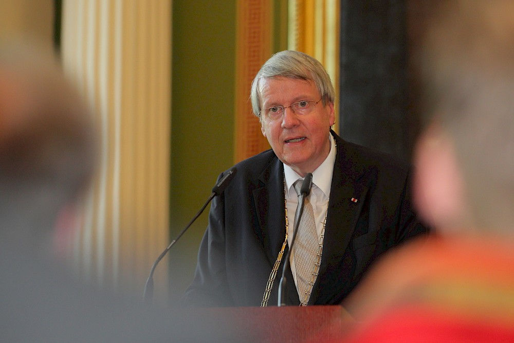 In seiner Eröffnungsrede machte Rektor Prof. Dr. Udo Sträter deutlich, warum sich die Uni Halle an diesem Tag auf ihre Traditionen – auf Zepter und Talare – beruft. Beides stehe für eine akademische Freiheit, die es gegen Gefährdungen von außen und von innen zu schützen gelte. Sträter forderte dazu auf, Restriktionen akademischer Freiheit in aller Welt stets zu widersprechen. „Universitäten brauchen Raum für den offenen Diskurs, und dafür sind Standards nötig. Es gibt kein Recht auf bewusst zelebrierte Ignoranz.“